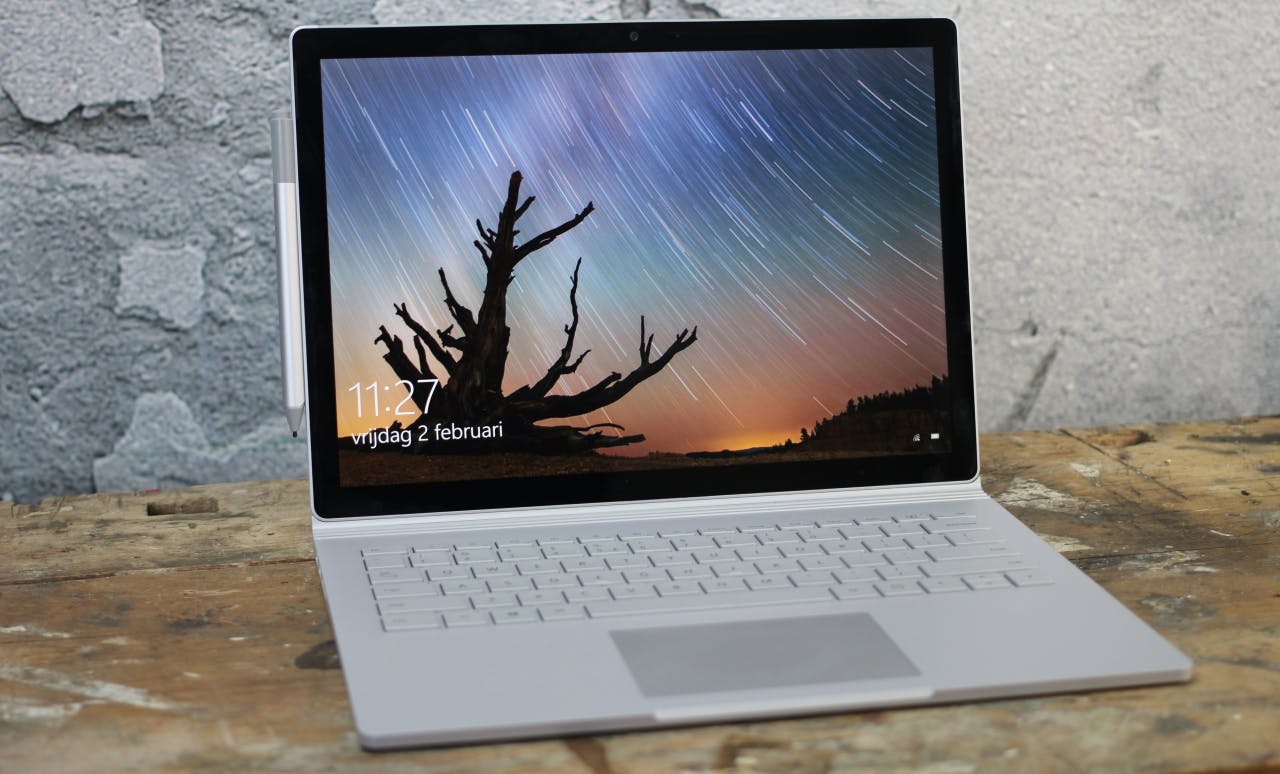 Het schermpaneel is om de vingers bij af te likken. Figuurlijk dan, aangezien het natuurlijk om een touchscreen gaat. De Surface Book heeft een wat eigenaardige beeldverhouding van drie bij twee, in praktijk merk je daar eerlijkgezegd weinig van. Behalve dat het fullscreen bekijken van foto’s en video’s wat meer zwarte randen oplevert. Het scherm is haarscherp, dankzij een hoge resolutie van 3.000 bij 2.000 pixels. Ook het contrast en kleurweergave zijn dik in orde. Dat is niet gek ook, want Microsoft wil graag professionals en creatievelingen aanspreken met z’n laptop. Bijvoorbeeld designers, voor wie schermkwaliteit en -kalibratie belangrijk zijn.