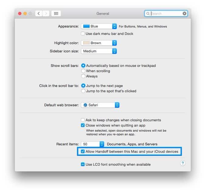 Met Macs is de situatie wat ingewikkelder vanwege het enorme aantal verschillende modellen die er zijn. Om te beginnen moet je OS X Yosemite draaien, wat je in de Mac App Store kunt vinden als je nog niet geüpgraded hebt. Je kunt controleren of Handoff beschikbaar is voor je Mac door naar System Preferences te gaan en op het General icoon te klikken. Als er ergens onderaan een vakje staat met Allow Handoff Between This Mac and Your iCloud Devices dat je aan kunt vinken, kun je Handoff gebruiken. Als het er niet staat, kan het helaas niet.