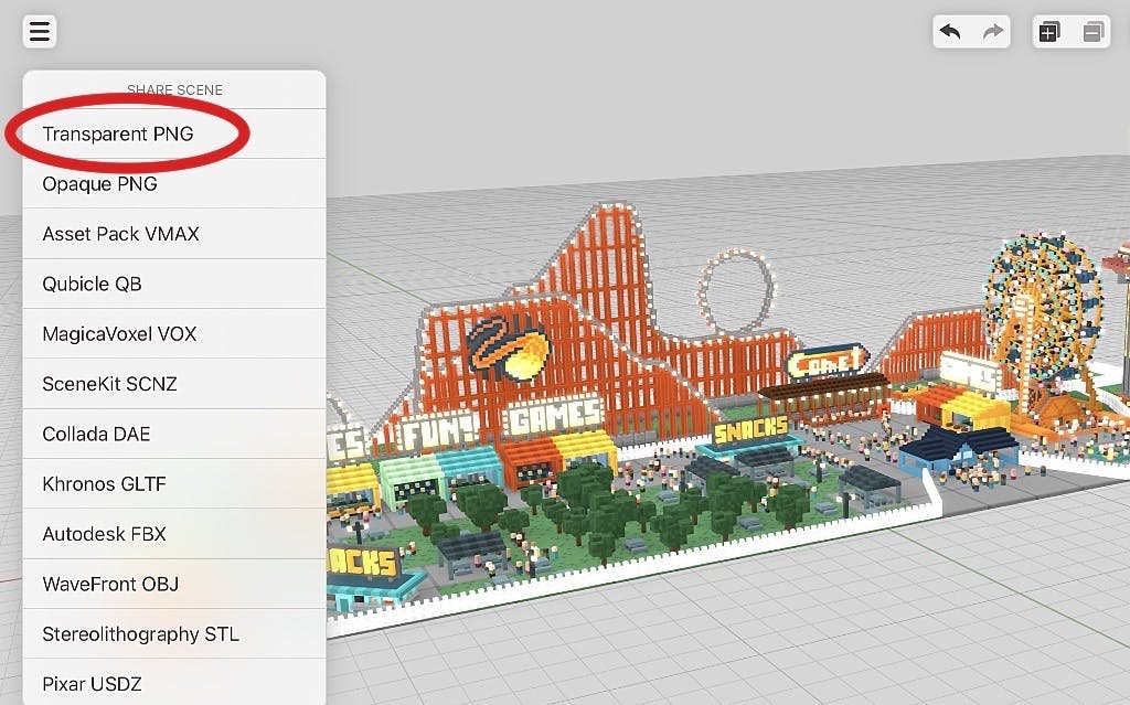Zet jouw voxel-afbeelding dus zó neer als je hem straks in de export wilt zien, weer met gebruikmaking van je vingers. Tik dan op de knop met de drie puntjes linksboven in beeld. Kies de optie Share scene en dan Transparant PNG. Wacht even en je ziet een preview. Tevreden? Tik dan op de deelknop rechtsboven en kies als opslag (bijvoorbeeld) Save Image.