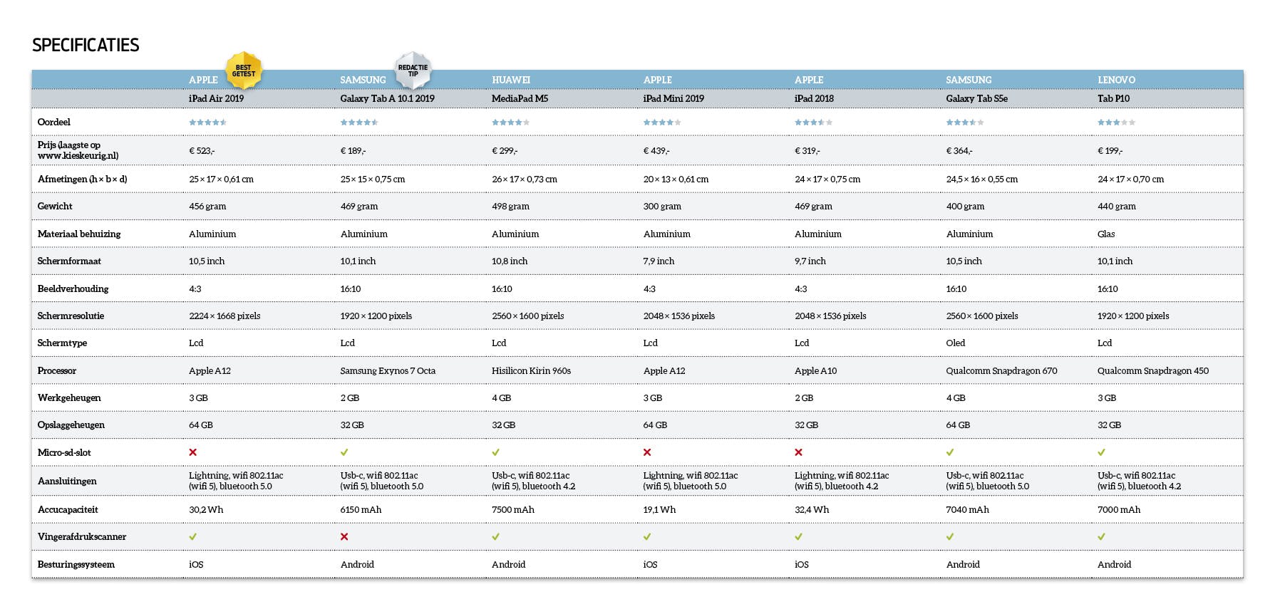 We testen zeven populaire tablets die sinds kort of al wat langer te koop zijn. Van Apple zijn dat de goedkoopste reguliere iPad, de kleinere iPad Mini en de duurdere iPad Air 2019. We gaan ook aan de slag met de betaalbare Lenovo Tab P10 en middenklasser Huawei MediaPad M5 10.8. Tenslotte voelen we de goedkope Samsung Galaxy Tab A 10.1 (2019) en duurdere Galaxy Tab S5e aan de tand. Met uitzondering van de iPad Mini (7,9 inch) hebben de tablets schermen van ongeveer 10 inch. We testen de versies met de kleinste opslagcapaciteit: vier met 32 GB en drie met 64 GB. We letten bij het testen onder andere op de bouw- en schermkwaliteit, de algemene prestaties en de accuduur. We kijken ook naar de gebruiksvriendelijkheid van de software en het updatebeleid. We vergelijken de tablets niet als directe concurrenten, want dat zou niet eerlijk zijn omdat de prijzen en specificaties sterk uiteenlopen. De tablet met de beste prijs-kwaliteitverhouding krijgt het keurmerk Redactietip en de beste tablet het keurmerk Best Getest. De vermelde prijzen zijn de laagste prijzen op www.kieskeurig.nl medio juli 2019 en kunnen inmiddels anders zijn.