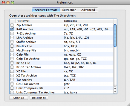 The Unarchiver pakt al deze formaten wel goed uit, of het nu om rar, 7z of om andere varianten gaat. Prettig is dat The Unarchiver niet meteen uw Mac overneemt door ongevraagd de standaard-archiefmanager voor alle gecomprimeerde formaten te worden. Het programma is eenvoudig te installeren. Sleep het programma - nadat u het hebt gedownload - naar de map met programma’s en start het. Selecteer alle gewenste formaten en sla deze instellingen op. Kijk ook even op het tweede tabblad, want daar kunt u aangeven waar de uitgepakte bestanden moeten worden opgeslagen. Als u de gewenste locatie hebt aangegeven, kunt u uw bestanden voortaan met The Unarchiver uitpakken.