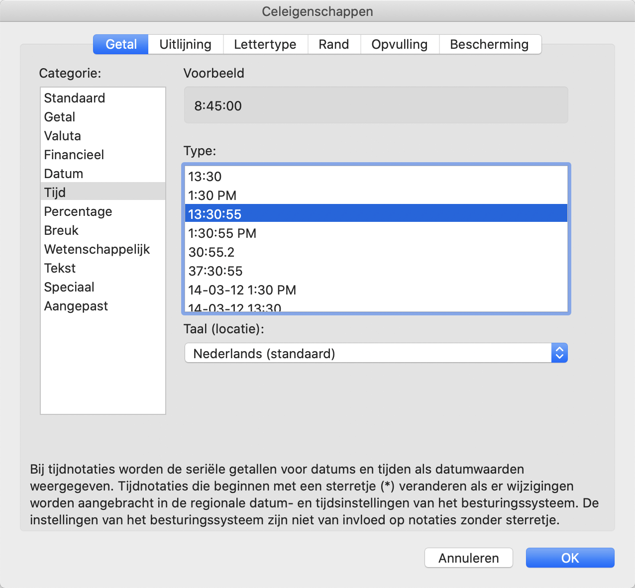 Om een tijdwaarde in Excel in te voeren klik je in een cel en geef je een tijdwaarde in volgens het formaat uu:mm:ss, bijvoorbeeld 7:45:00. Nadat je deze waarde hebt ingegeven, selecteer je deze en alle andere cellen waarin tijdsaanduidingen moeten komen en dan open je de Celeigenschappen via de rechtermuisknop. Gebruik het tabblad Getal en kies aan de linkerkant de categorie Tijd. Rechts selecteer je de manier waarop het programma de tijdsaanduiding moet weergeven.
