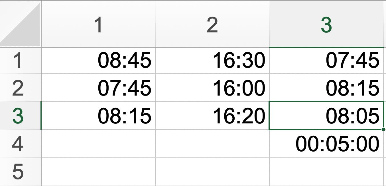 Veronderstel dat je op deze manier een kolom met aantallen uren hebt gemaakt die je bij elkaar moet optellen om te zien hoelang er in totaal is gewerkt. Dan zorg je ervoor dat elke cel de eigenschap Tijd heeft gekregen. In dit voorbeeld hebben we begin- en eindtijd genoteerd en in de derde kolom vragen we dus het verschil tussen die twee tijdstippen. Wanneer je de som van de werktijd wilt weten, ontstaat een probleem als het totaal meer dan 24 uur bedraagt. Probeer maar eens 7:45, 8:15 en 8:05 op te tellen. Het resultaat lijkt: 00:05:00