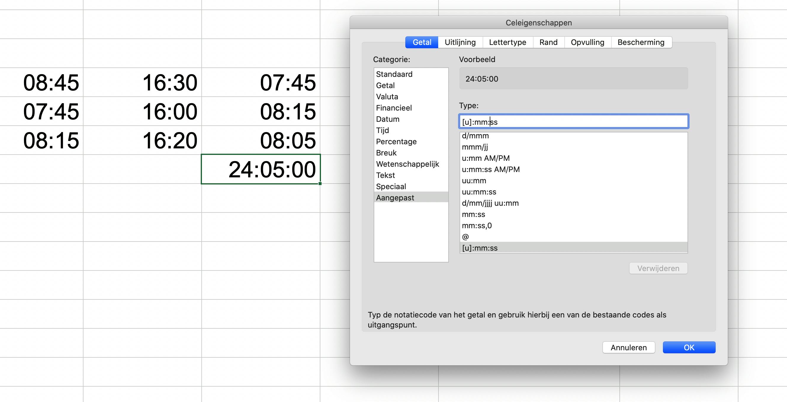 De verklaring zit in het feit dat Excel standaard de 24-uursweergave hanteert en het totaal, in dit geval 24:05 uur, interpreteert als 24:00:05 en dus 00:05:00 uur weergeeft. Om dit op te lossen moet je met de rechtermuisknop op de cel klikken waar het totaal wordt berekend, zodat je weer de Eigenschappen kunt openen. Selecteer deze keer opnieuw het tabblad Getal en kies daar de categorie Aangepast. Vervolgens kies je in de lijst onder Type de optie [u]:mm:ss. Klik ten slotte op OK om het correcte aantal gewerkte uren te zien. Let erop dat je de juiste optie kiest in de lijst met mogelijkheden. Je moet de optie hebben met de blokhaakjes voor en achter de uren.