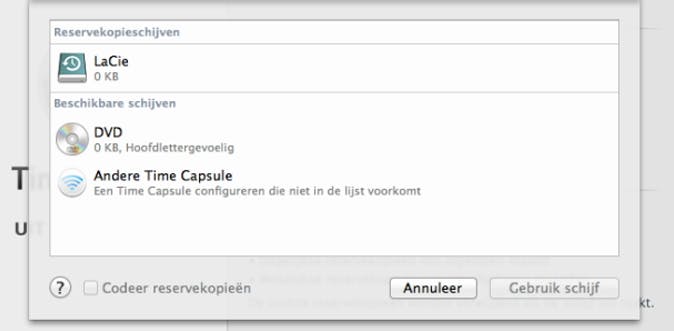 Je ziet nu een scherm met zeer weinig opties en dat komt omdat het instellen echt een kwestie is van een paar keer klikken, meer niet. Klik op Selecteer reservekopieschijf en selecteer de schijf waarop je de back-ups wilt opslaan. Je ziet hier dat je optioneel dus ook kunt kiezen voor een dvd, maar dat is niet zo praktisch gezien de grootte van een gemiddelde Mac-schijf. Klik nu op Gebruik schijf.