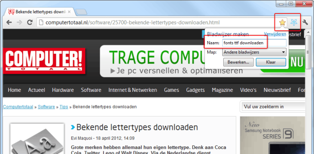 De naam van de bladwijzer is gelijk aan de naam van de websitepagina. Omdat deze vaak niet overeenstemt met jouw eigen zoekwoorden, is het goed om de bladwijzer een betere naam te geven. Druk nogmaals op het sterretje en geef bij Naam een omschrijving op die logisch is om de bladwijzer ooit terug te vinden.