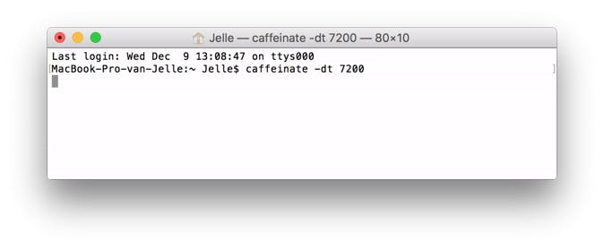 Je kunt ook een tijdslimiet specificeren, waarna de fucntie zich automatisch uitschakelt. Zo kun je bijvoorbeeld instellen dat je Mac twee uur actief blijft. Je moet hier wel het aantal seconden weten, dus dat moeten we even uitrekenen. 2 uur x 60 minuten x 60 seconden geeft 7200 seconden. Dit vullen we in: caffeinate -dt 7200.