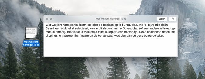 Als je een stuk tekst wilt bewaren, kun je dit natuurlijk kopiëren naar Notities of een document in Pages of Word. Wat wellicht handiger is, is om de tekst op te slaan op je bureaublad. Als je, bijvoorbeeld in Safari, een stuk tekst selecteert, kun je dit slepen naar je Bureaublad (of een andere willekeurige map in Finder). Hier slaat je Mac deze tekst nu op als een bestandje. Deze bestanden heten text clippings, en baseren hun naam op de eerste paar woorden van de geselecteerde tekst.