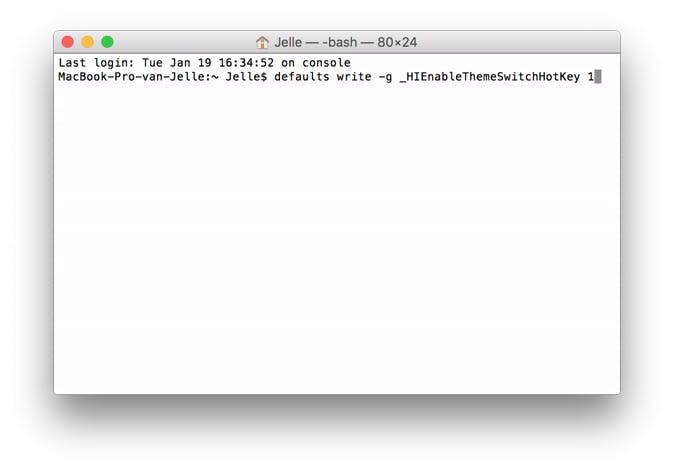 Mocht je dit willen uitzetten, open dan Terminal weer, vul de volgende zin in en druk op enter: defaults delete -g _HIEnableThemeSwitchHotKey. Log jezelf nu uit en weer in. De sneltoets zou nu niet meer moeten werken.
