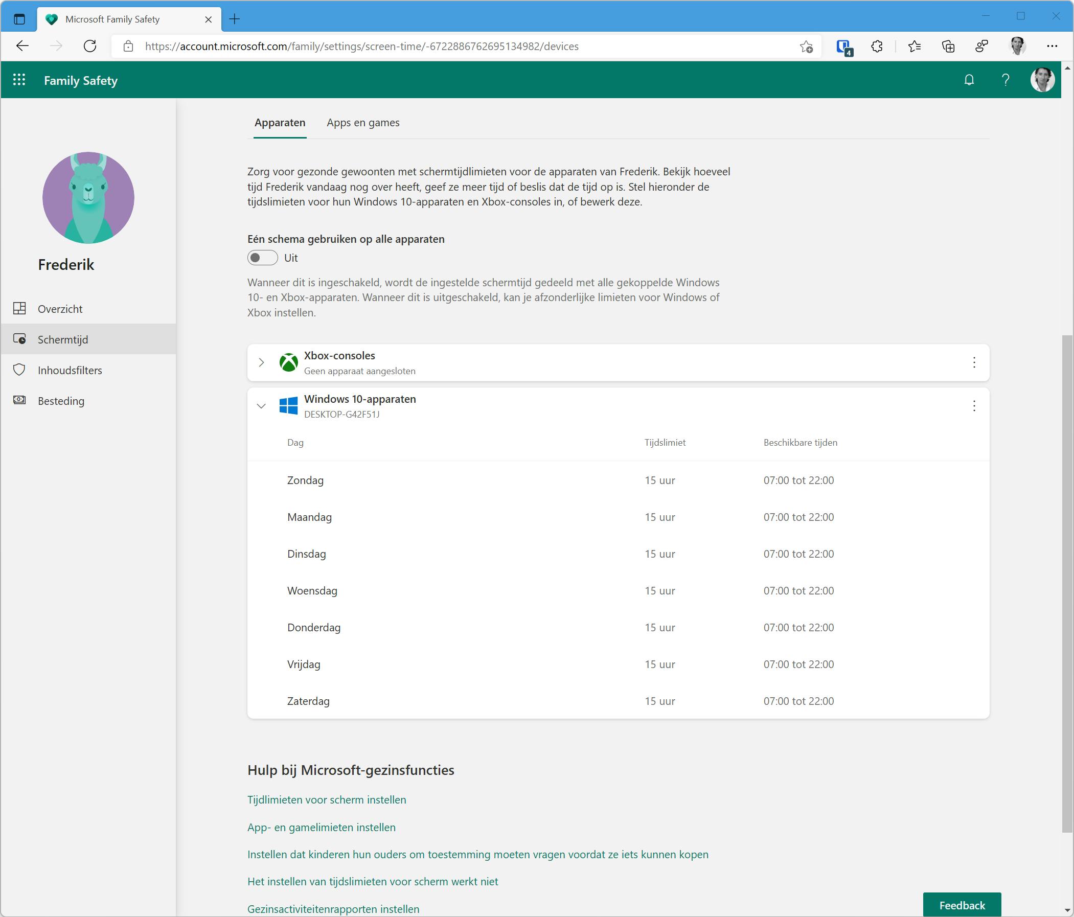Je kunt per apparaat een schermtijdlimiet instellen. Zo kun je onderscheid maken tussen bijvoorbeeld een laptop en een Xbox. In plaats hiervan kun je ook één schema maken dat op alle apparaten van toepassing is. Zet de schuif op Aan bij de optie Eén schema gebruiken op alle apparaten.