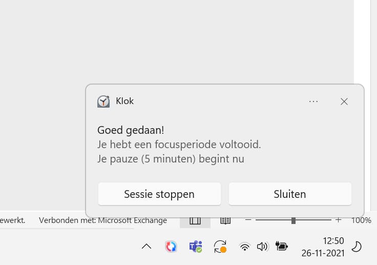 De functie maakt deel uit van de app Klok. Open het Startmenu en typ Klok. Links in het venster vind je het onderdeel Focussessies. Geef rechts in het venster aan hoeveel minuten je ongestoord wilt doorwerken. Klik op Focussessie starten. De klok begint met aftellen en geeft aan wanneer de eerstvolgende pauze plaatsvindt.