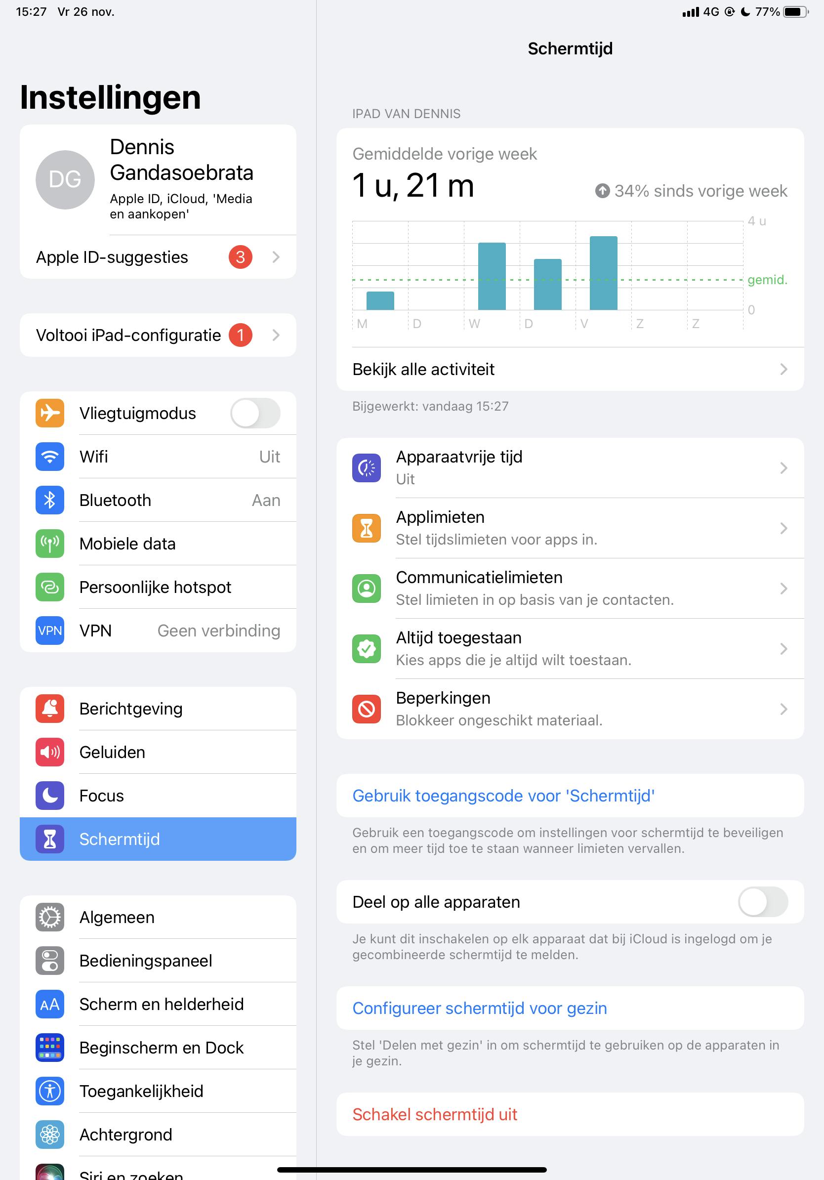Wordt de iPad (of iPhone) binnen het gezin ook door anderen gebruikt? Je kunt de instellingen voor schermtijd ook laten gelden voor de andere gezinsleden. Tik op Configureer schermtijd voor gezin. Volg de stappen van de wizard om de limiet toe te passen.