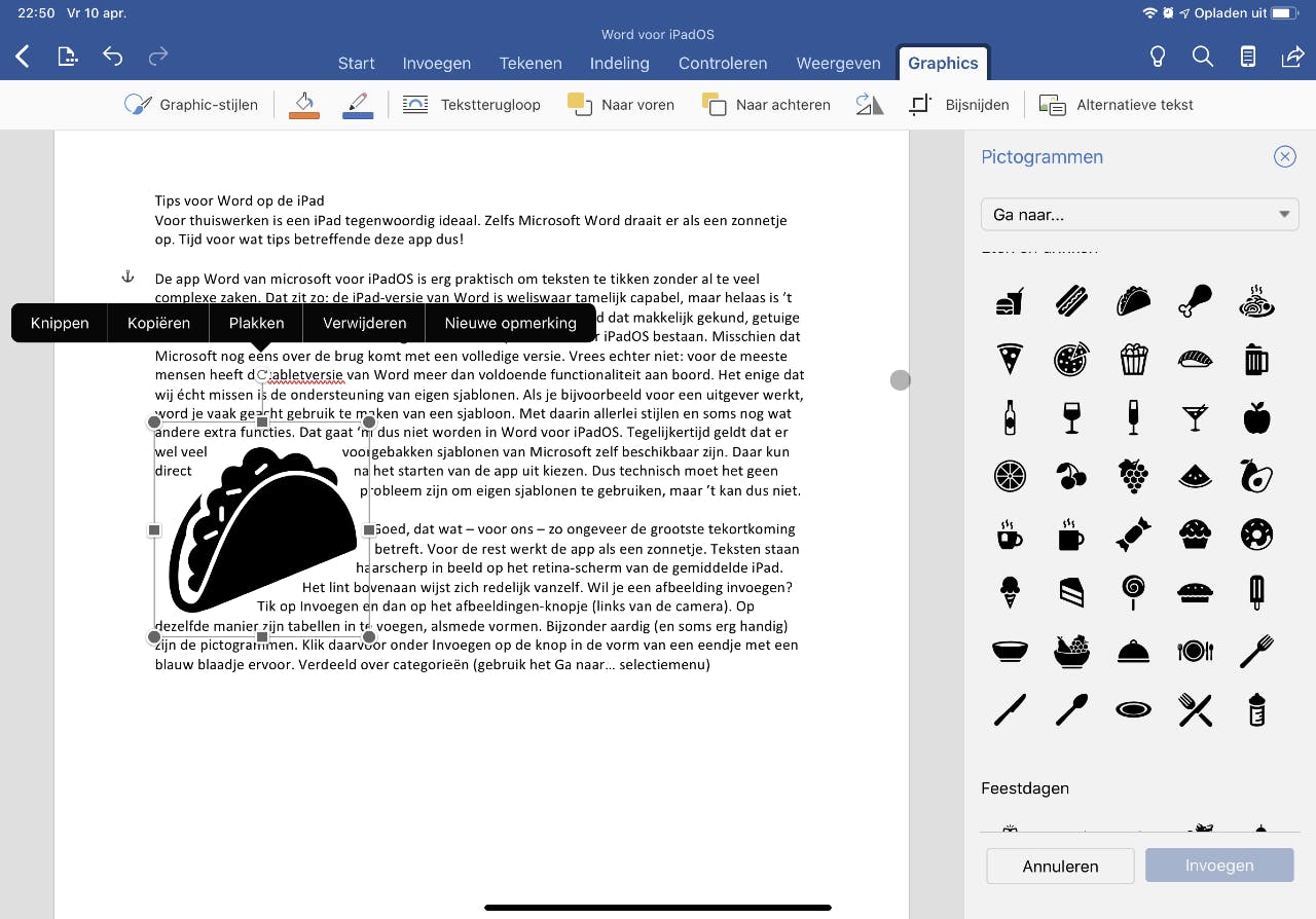 Goed, dat wat – voor ons – zo ongeveer de grootste tekortkoming betreft. Voor de rest werkt de app als een zonnetje. Teksten staan haarscherp in beeld op het retina-scherm van de gemiddelde iPad. Het lint bovenaan wijst zich redelijk vanzelf. Wil je een afbeelding invoegen? Tik op Invoegen en dan op het afbeeldingen-knopje (links van de camera). Op dezelfde manier zijn tabellen in te voegen, alsmede vormen.