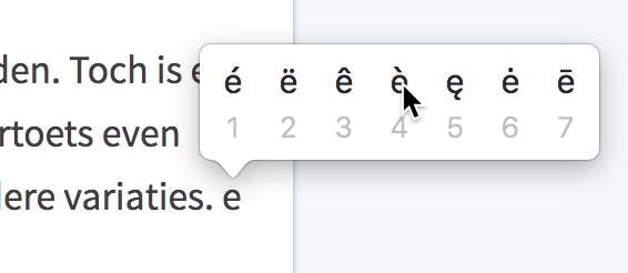Na een tijdje weet je de meest gebruikte toetsen vast wel zonder nadenken te vinden. Toch is en blijft het soms zoeken. Of niet? Het kan namelijk nóg makkelijker! Houd een lettertoets even ingedrukt en je ziet een lijstje verschijnen met alle mogelijke accenten, trema's en andere variaties. Druk op het cijfer dat behoort bij de variant die je in wilt voeren en klaar. Of klik simpelweg met de muis op de gewenste letter. Dit trucje werkt overigens alléén voor klinkers. Blijven over speciale symbolen en natuurlijk de onvermijdelijke smileys. Die voeg je rap in door gebruik te maken van de Emoji- en symbolen-tool. Die open je door een klik op het bijbehorende pictogram in de menubalk van macOS, rechtsboven. Meestal staat hij direct links van de klok. Dubbelklik op een smiley of een symbool en het wordt ingevoegd in je tekst. Alles is keurig onderverdeeld in categorieën, dus het zal niet heel moeilijk worden om te vinden wat je zoekt.