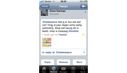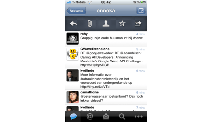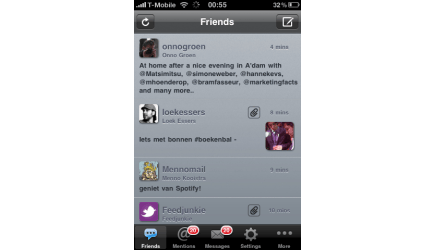 Een van de meest geliefde mobiele Twitterclients voor de iPhone is Tweetie. Dat komt met name door de interface. Het enige dat zichtbaar is, is een leeg scherm, met het bekende toetsenbord en het aantal tekens dat resteert. Maar als u op dit knopje klikt, wordt een zestal extra opties zichtbaar. Zo kunt u foto's of video's toevoegen en met één druk op de knop lange url's inkorten. Sinds versie 2 wordt ook geotagging ondersteund. Het refreshen van de tweetstream werkt anders dan u gewend bent op de iPhone: u schuift de berichten naar beneden. Als u weer loslaat, worden de tweets ververst. En veeg over een tweetbericht en er worden vijf shortcuts zichtbaar.