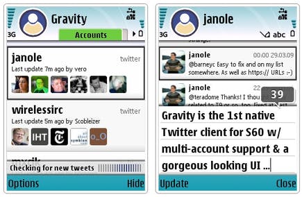 De marktleider op smartphone-gebied is natuurlijk nog steeds Nokia. En ook voor Nokia's besturingssysteem Symbian zijn diverse Twitterclients beschikbaar, zoals Gravity. De populairste Twitterclient voor de S60 is verkrijgbaar voor 9,95 dollar, waarbij de licentie is gekoppeld aan het unieke IMEI-nummer van uw telefoon. Uiteraard zijn alle standaard mogelijkheden mogelijk, kunt u zoeken, favorieten instellen etcetera. Verder kunt u met Gravity meerdere Twitter-account beheren en foto's uploaden via TwitPic. De naam van deze Twitterclient wordt eer aangedaan met de coolste feature van Gravity: 'kinetisch scrollen'. Als u een Nokia 5800 of N97 hebt, kunt u door simpelweg uw smartphone te kantelen scrollen door uw tweets.
