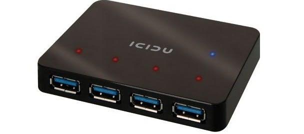 Een voorbeeld van een usb 3.0-hub met voeding is de AI-707946 USB 3.0 Slim Hub 4 Ports. Prijs: 20 euro.