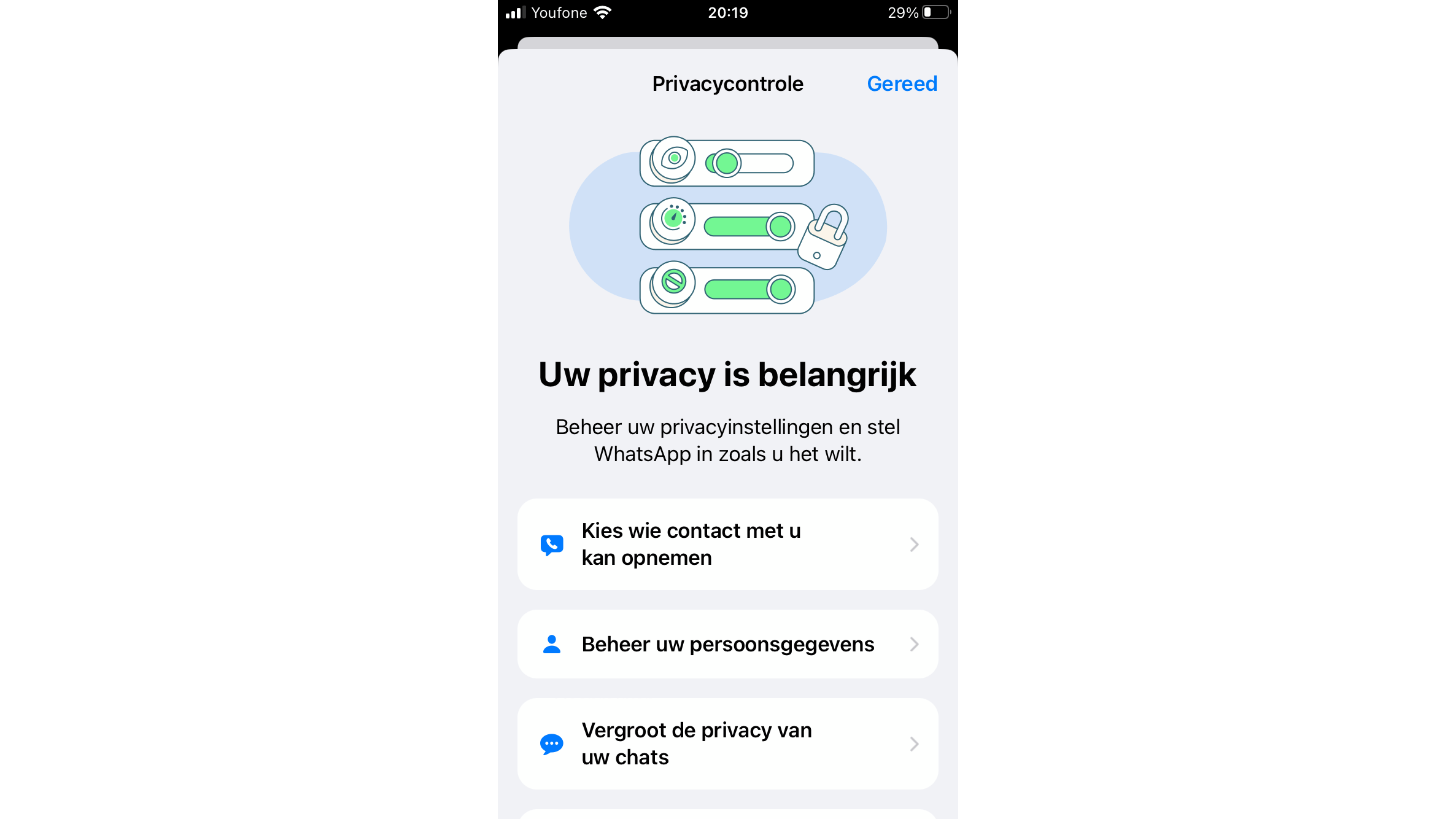 Toch telt juist WhatsApp flink wat privacyfuncties. Zo kun je versleutelde berichten verzenden en verstuurde appjes naderhand voor iedereen wissen. Je kunt vanuit de instellingen zelfs een heuse privacycontrole uitvoeren. Zo bepaal je onder meer wie jouw profielfoto kan zien en stel je voor verstuurde berichten eventueel een vervaldatum in. Houd er wel rekening mee dat WhatsApp gebruikersdata verzamelt.