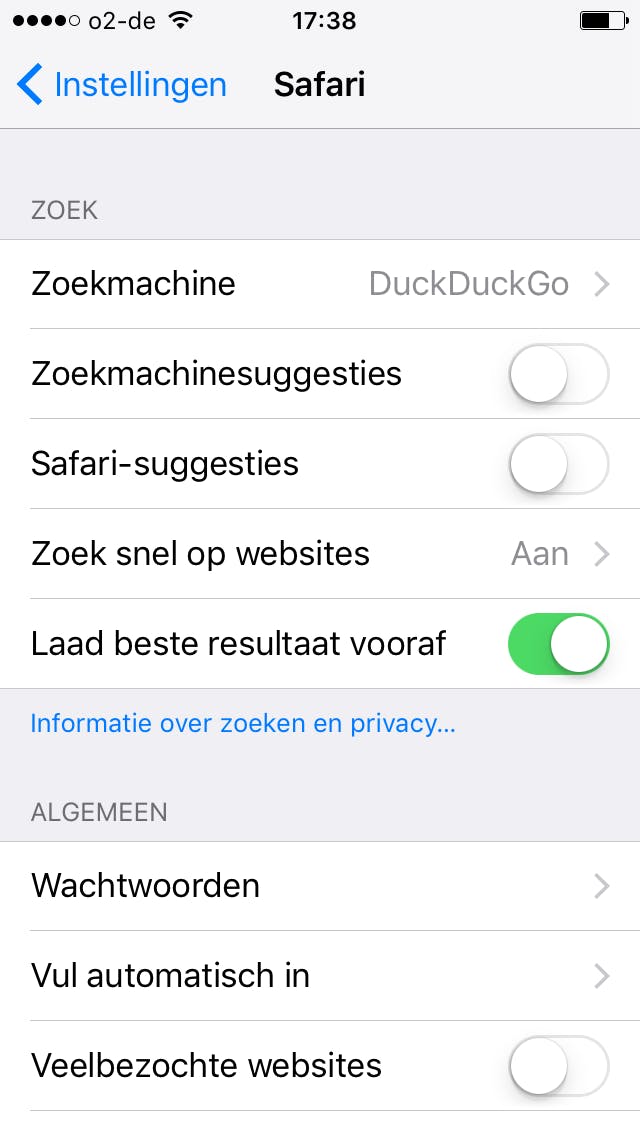 Safari kan je ook suggesties doen, gebaseerd op websites die je vaker hebt bezocht. In het kader van privacy wil je deze suggesties misschien ook uitzetten. Zet daarom de schuif achter Safari-suggesties uit.