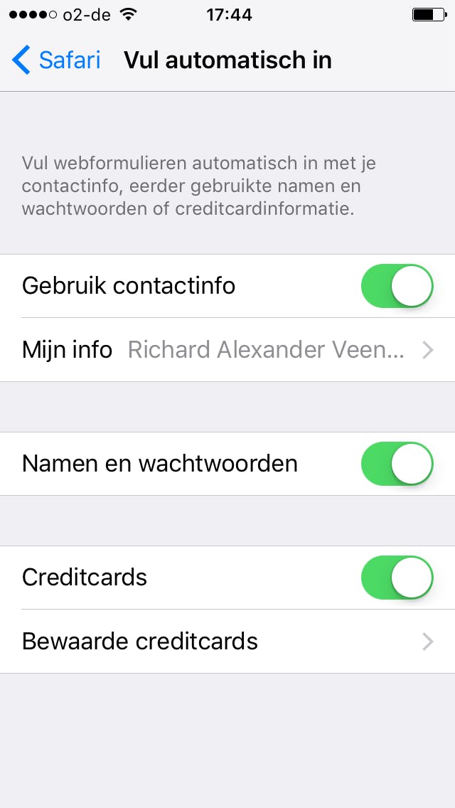 Wil je dit niet, ga dan weer naar Instellingen / Safari en kies voor Vul automatisch in. Zet de schuiven achter de onderdelen uit die je niet automatisch wilt laten invullen. Check bij Bewaarde creditcards welke creditcard-gegevens Safari heeft. Wil je een creditcard verwijderen, tik dan op Wijzig en selecteer de creditcard. Kies voor Verwijder om de kaart te verwijderen.