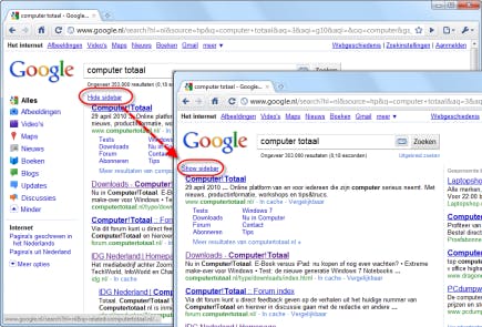 De nieuwe lay-out van de zoekresultatenpagina is natuurlijk even wennen. De zoekresultaten beginnen niet meer direct aan de linkerkant van uw scherm, maar een stuk naar rechts, doordat er een extra zijbalk aan is toegevoegd. Houdt u niet van verandering, dan hebt u pech: de nieuwe zijbalk is namelijk niet weg te klikken. En dat is waar heel wat mensen nogal verbolgen over zijn. Gelukkig zijn er diverse mogelijkheden om hier wat aan te doen.