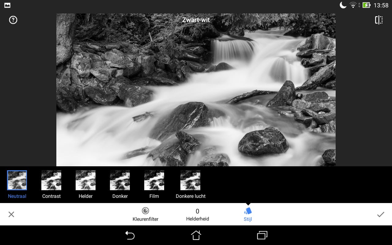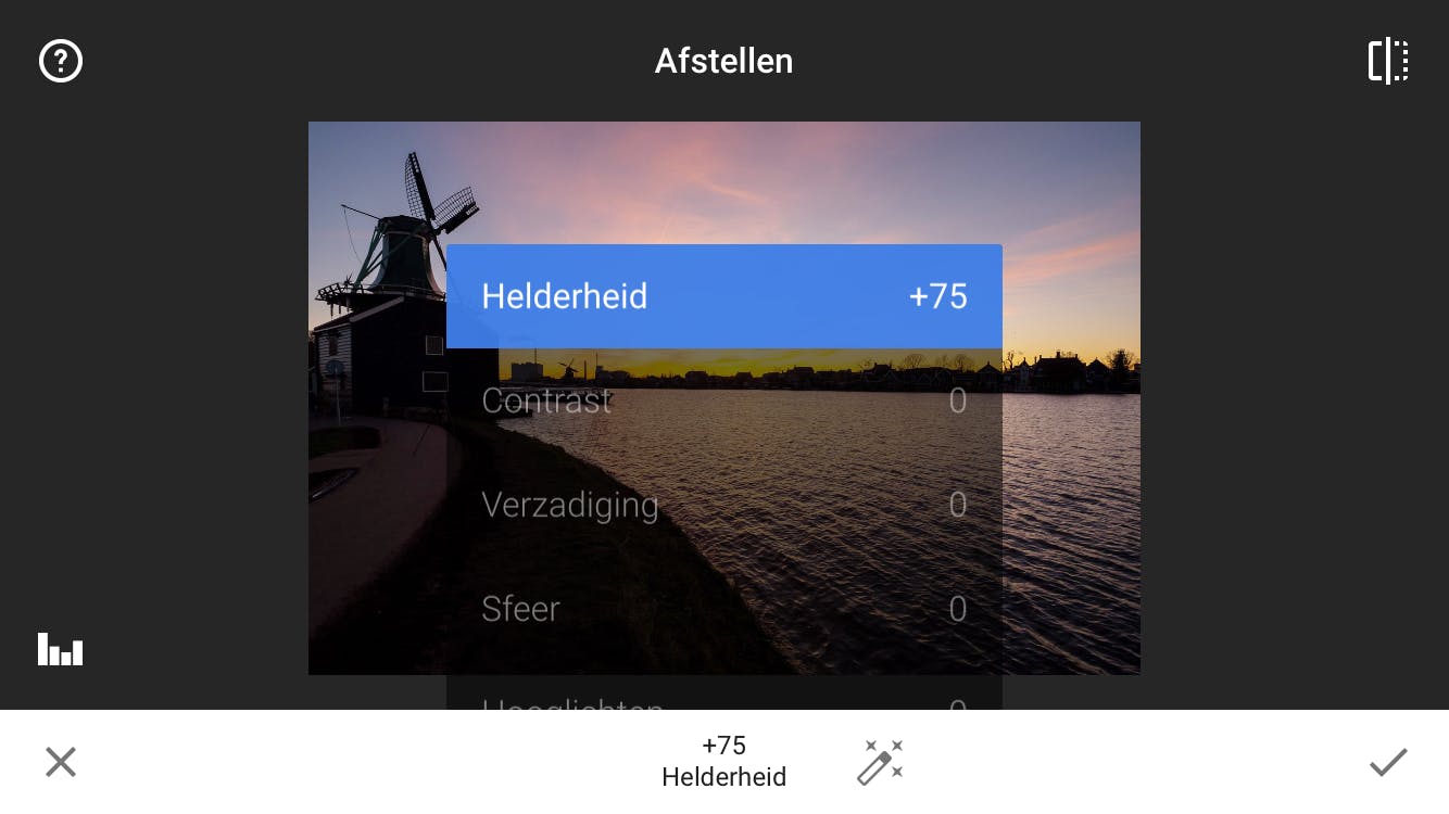 Het is een goed idee om te beginnen met de bewerkingen die je onder Tools / Afstellen vindt. Je optimaliseert er de belichting en de kleuren, dus daar valt erg veel winst te behalen. Stel dat een foto onderbelicht is (te donker) of juist overbelicht (te licht), dan los je dat hier eenvoudig op. Veeg eerst verticaal over het scherm om Helderheid te kiezen. Veeg daarna horizontaal om de belichting beter in te stellen. Naar links wordt de foto donkerder, naar rechts lichter. Een bewerking selecteren en vervolgens toepassen doe je in Snapseed trouwens altijd door eerst verticaal en daarna horizontaal te vegen.