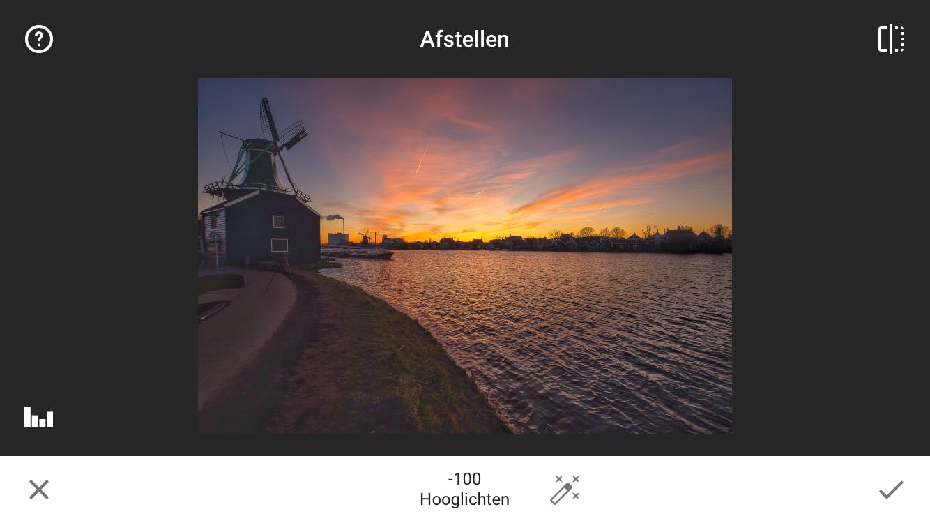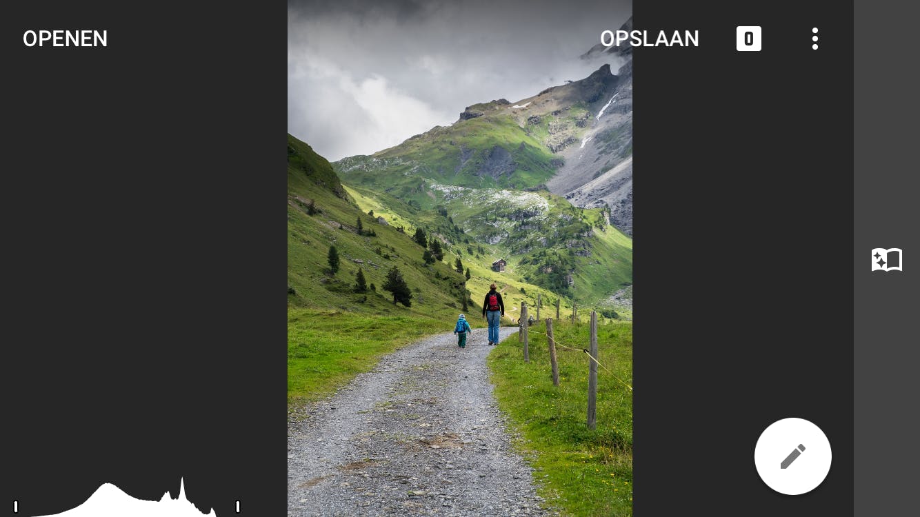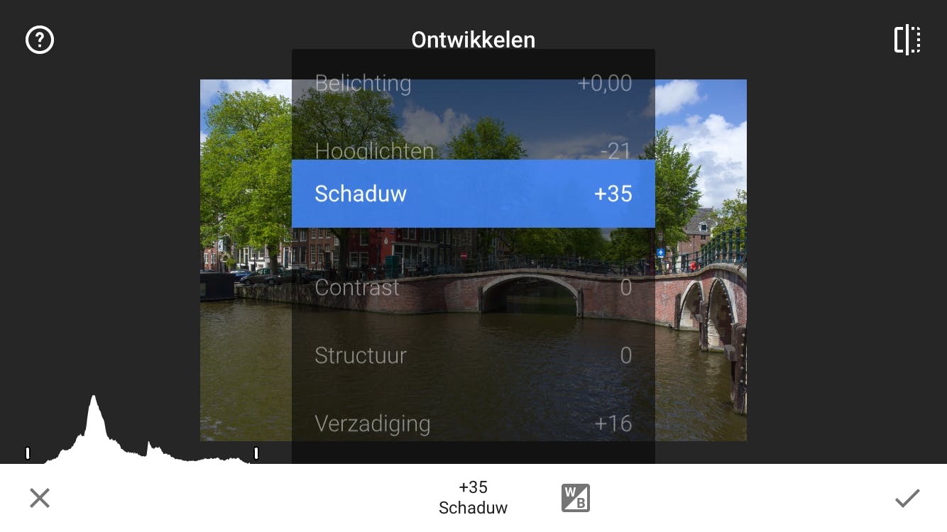 Het onderdeel Afstellen kent een hulpmiddel dat een beetje verborgen zit: het histogram. Linksonder in de foto zie je een klein staafdiagram. Tik erop en je krijgt een grafiek te zien met allemaal pieken – het heeft wel wat weg van een berglandschap. Dit is het histogram en het laat de lichtverdeling in een foto zien. Als je even vergeet dat er kleuren bestaan, kan elk puntje in een digitale foto zwart, wit, of een van de vele tinten grijs zijn. Uiterst links in het histogram staat daarom voor zwart, rechts is volledig wit en ertussenin vind je alle mogelijke grijstinten. Het histogram is een krachtig hulpmiddel. Als je erop let tijdens het aanpassen van de belichting, zie je heel goed wat er ‘onder de motorkap’ gebeurt. Je ziet bijvoorbeeld hoe de donkere of juist de lichte delen van een foto verschuiven. Zo leer je vanzelf hoe je het uiterste uit je foto’s kunt halen.