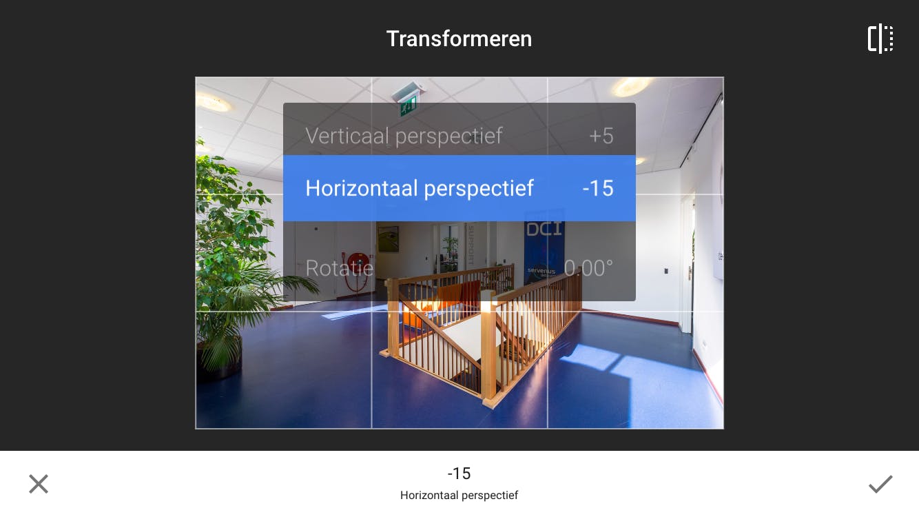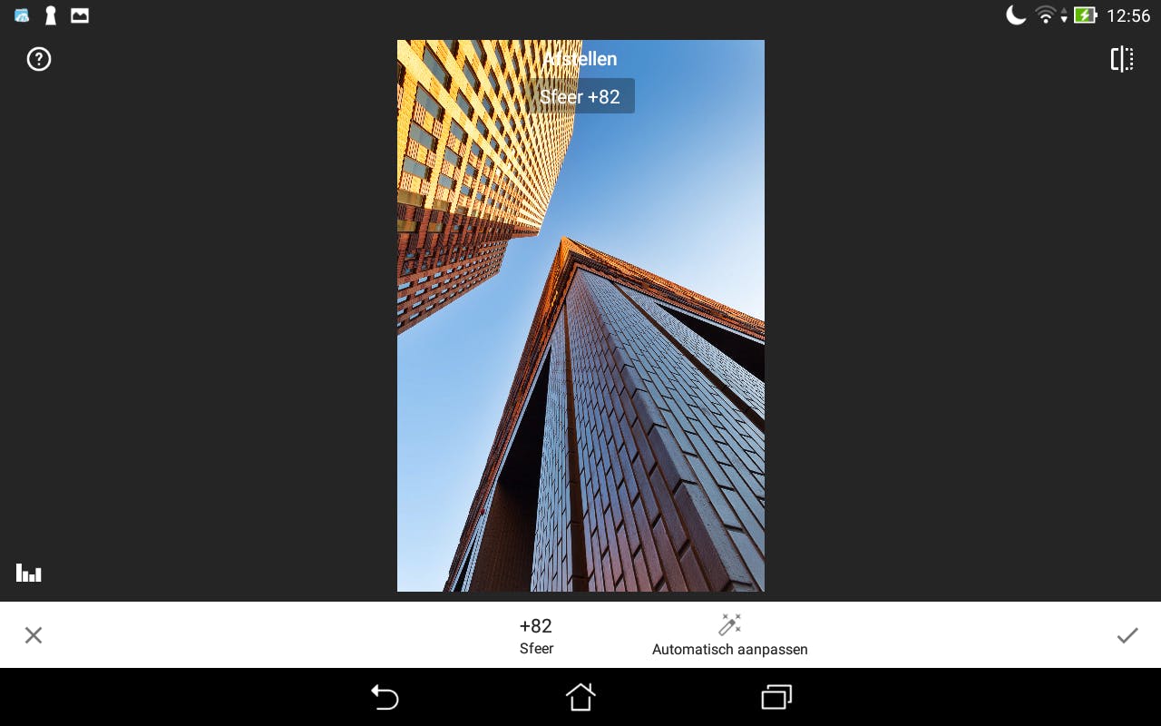 Tools / Transformeren gebruik je om perspectiefcorrecties aan te brengen. Het is een zeer krachtige maar ook beetje lastige bewerking. Dit gereedschap heb je vaak nodig als je gebouwen of iets anders met rechte lijnen of vlakken fotografeert. Momenteel werkt dit verschillend onder iOS en Android. Op een Apple-apparaat zet je met Verticaal perspectief en Horizontaal perspectief alles dan alsnog perfect in het lood, als je er net niet recht voor stond of de camera schuin hebt gehouden. Met Rotatie draai je een foto. Bijzonder is dat Snapseed kale hoeken en randen die hierbij ontstaan automatisch opvult met passend beeldmateriaal. Op een Android-apparaat veeg je opmerkelijk genoeg niet verticaal om de gewenste correctie te kiezen. In plaats daarvan zie je ditmaal allerlei pictogrammen met pijltjes. Die geven aan in welke richtingen je correcties uitvoert zodra je met je vinger sleept. Via de optie Egaliseren onderin geef je aan of kale hoeken en randen automatisch opgevuld mogen worden.