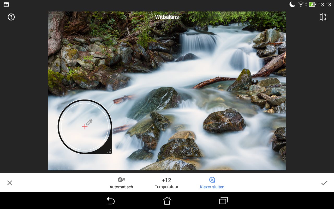 Onder Tools vind je – momenteel alleen op Android-apparaten – de bewerking Witbalans. Hiermee stel je de kleuren nog nauwkeuriger af, zodat je een foto er heel natuurlijk kunt laten uitzien. Via Temperatuur regel je net als daarnet weer de kleurtemperatuur. Naar links koel je de foto af door hem blauwer te maken, naar rechts warm je hem op en wordt het beeld meer oranje. Waar nodig gebruik je aanvullend Tint om meer richting groen (links) of magenta (rechts) te verschuiven. Met deze twee bewerkingen kun je vrijwel elke kleurzweem weghalen, of je voegt juist een creatieve kleurzweem toe. Daarmee bedenk je jouw eigen filter. Kleurzwemen verhelpen kan ook makkelijker. Als je onderin op AW Automatisch tikt, lost Snapseed het vaak volledig zelf op. Of gebruik Kleurkiezer en plaats het pipet op iets waarvan je zeker weet dat het wit, zwart of grijs hoort te zijn. Dan berekent Snapseed de juiste kleurcorrectie.