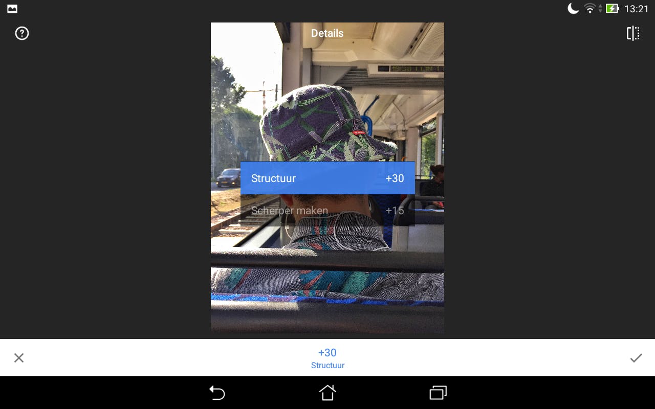Gebruik Tools / Details als je een foto er scherper of gedetailleerder wilt laten uitzien. Kies Scherper maken om een foto te verscherpen. De contouren van alles wat je op de foto ziet worden versterkt, zodat het beeld net wat scherper oogt. Gebruik Structuur om iets soortgelijks te doen met de textuur. Doordat dan zelfs de allerkleinste details worden benadrukt, springt alles op de foto ineens van je beeldscherm af. Pas vooral met deze tweede bewerking wel een beetje op. Zorg ervoor dat je hem gedoseerd toepast, om de foto niet te gedetailleerd en daarmee te onnatuurlijk te maken.