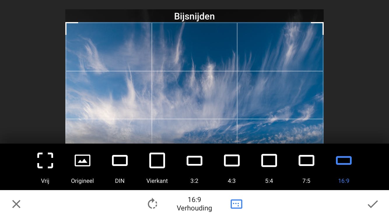 Kies Tools / Bijsnijden om het beeldformaat van de foto te veranderen. Je kunt hem bijvoorbeeld vierkant maken, of omzetten naar breedbeeld (16:9). Of veeg vanuit een hoek of vanaf de zijkant om de foto bij te snijden. Saaie delen of storende objecten langs de randen kun je zo eenvoudig wegsnijden. Met Tools / Draaien kun je de foto spiegelen en roteren, of een schuine foto netjes rechtop zetten door met je vinger te vegen. Standaard doet Snapseed dit laatste trouwens al meteen zodra je deze optie kiest, maar vaak kun je het zelf nog nét iets beter maken.