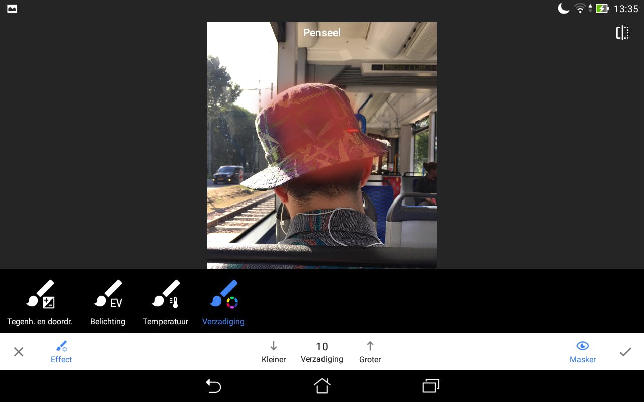 Foto’s mag je ook selectief bewerken. Kies Tools / Penseel en schilder met je vinger over delen van de foto die je wilt aanpassen. De rest blijft ongewijzigd. Je kunt de sterkte instellen en met Gum (de middelste sterkte) haal je penseelstreken weer weg. Zet Masker aan om te zien waar je allemaal hebt geschilderd. Er is keuze uit meerdere penselen, dus je kunt een deel lichter maken, een ander deel donkerder en ergens anders weer de kleuren veranderen. Het penseel Doordrukken en tegenhouden lijkt veel op het aanpassen van de belichting, alleen gaat het hiermee net wat subtieler. Om nauwkeuriger te werken kun je via een knijpbeweging inzoomen op de foto. Want hoe meer je inzoomt, hoe kleiner de penseelpunt lijkt te worden.