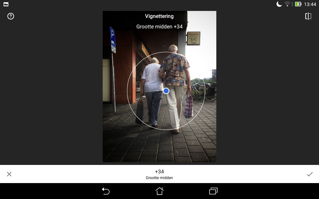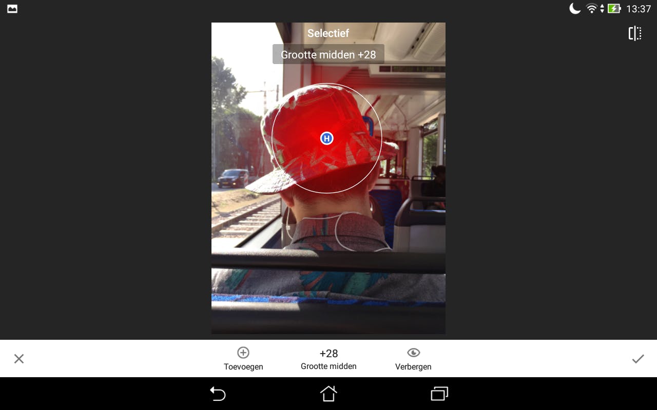 Ook Tools / Selectief is bedoeld om een foto plaatselijk te bewerken. Tik eerst op Toevoegen (het kleurt blauw) en tik daarna ergens in de foto. Daar wordt een zogenaamd controlepunt toegevoegd. Knijp met twee vingers om het gebied groter of kleiner te maken, of sleep met één vinger om het controlepunt te verplaatsen. Veeg daarna verticaal over het scherm om een bewerking te kiezen en horizontaal om de sterkte van het effect te kiezen. Alleen het ingestelde gebied verandert nu. Je mag meerdere van dit soort controlepunten plaatsen, om allerlei plaatselijke bewerkingen aan te brengen.