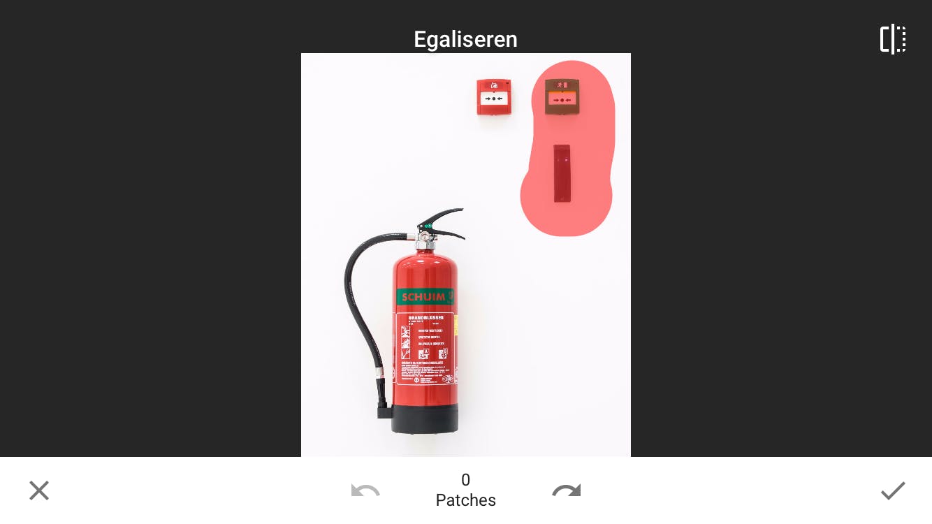 Zit er ergens op je foto een vlekje of een storend object? Ga naar Tools / Egaliseren en tik erop of veeg er met je vinger overheen zodat het rood kleurt. Laat los en het gemarkeerde verdwijnt uit de foto. Snapseed gebruikt beeldmateriaal uit je foto om het plekje onzichtbaar te repareren. Dat lukt zeker niet altijd, vandaar dat je het met Ongedaan maken weer kunt terugdraaien. Soms lukt het na een paar pogingen ineens beter. Vooral vlekken en objecten die los staan, dus die zich in een egaal vlak bevinden en niets anders raken of overlappen, haal je makkelijk weg.