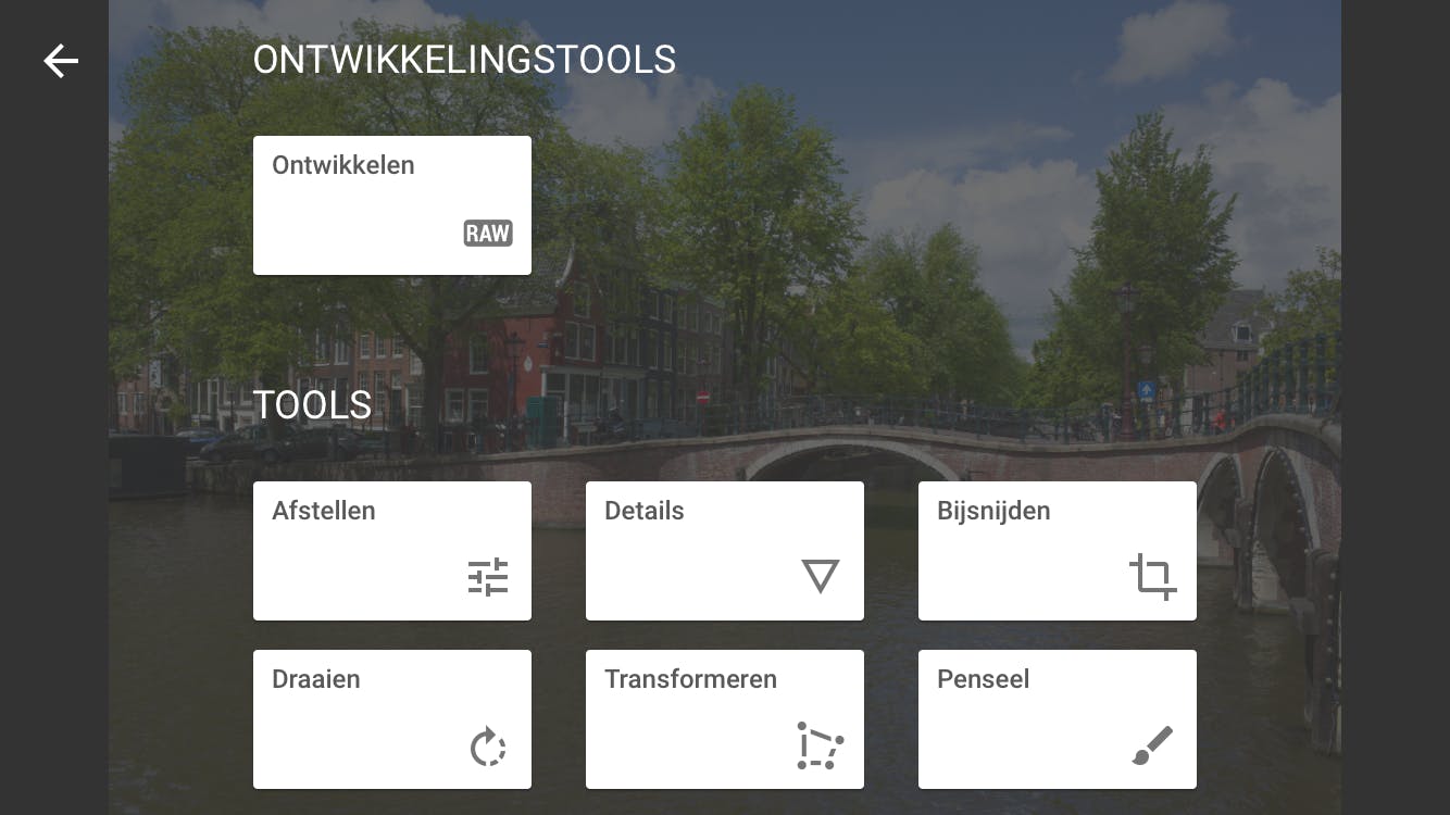 Steeds meer smartphones kunnen raw-bestanden opslaan. In plaats van een kant-en-klare jpg-foto krijg je dan een bestand waarin alle beeldinformatie nagenoeg ongewijzigd is opgeslagen. Wat is het nut hiervan? Een jpg-foto is flink door jouw smartphone bewerkt. Onder andere de belichting en de kleuren zijn aangepast om een mooi plaatje te maken dat je direct kunt gebruiken. De keuzes die hierbij zijn gemaakt, zijn niet meer ongedaan te maken. Vandaar dat een jpg-foto maar beperkt bewerkt kan worden. Ga je te ver, dan holt de beeldkwaliteit achteruit. Met een raw-bestand heb je dat probleem niet. Het is ongewijzigde, ruwe data, waardoor je meer ruimte hebt om zaken als kleur, contrast, scherpte en belichting op smaak te brengen. Je moet wel iets meer moeite doen, omdat een raw-bestand altijd bewerkt moet worden, maar de beloning is een zichtbaar mooiere foto. Snapseed herkent het meteen zodra je een raw-bestand opent en laat dan automatisch een nieuwe serie bewerkingen zien, genaamd Ontwikkelingstools / Ontwikkelen.