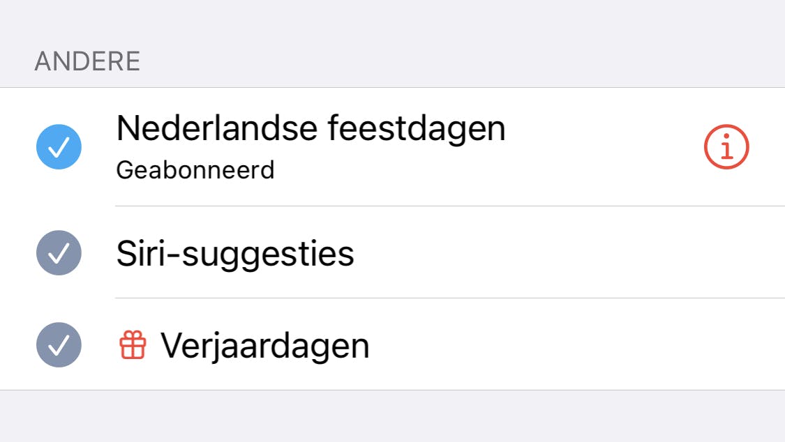 Heb je de verjaardagen in je telefoon gezet, maar zie je ze niet terug in je agenda? Dan kan het zijn dat de Agenda-app op je iPhone dit nog niet heeft gesynchroniseerd. Open in dit geval de Agenda-app en tik onderaan in het scherm op Agenda’s. Zet onder het kopje Andere een vinkje bij Verjaardagen en tik op Gereed. Nu zouden de verjaardagen wél in je agenda moeten staan.