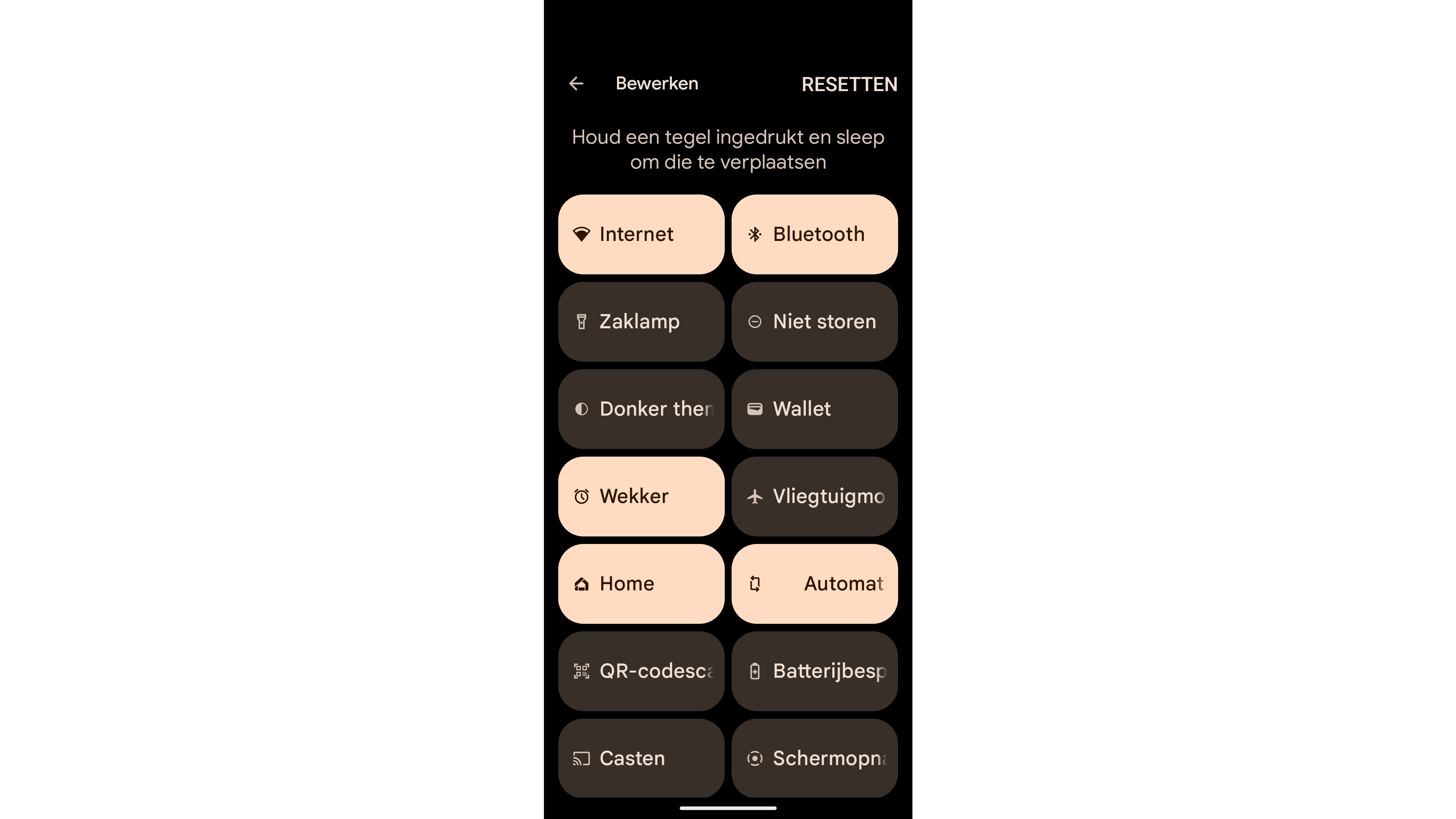 Via Snelle instellingen (veeg naar beneden en tik op het potloodicoon) kun je tegels voor specifieke acties toevoegen en positioneren voor directe toegang. Voorbeelden zijn Zaklamp, Niet storen, QR-code scannen, Batterijbesparing en andere circa vijftig opties.