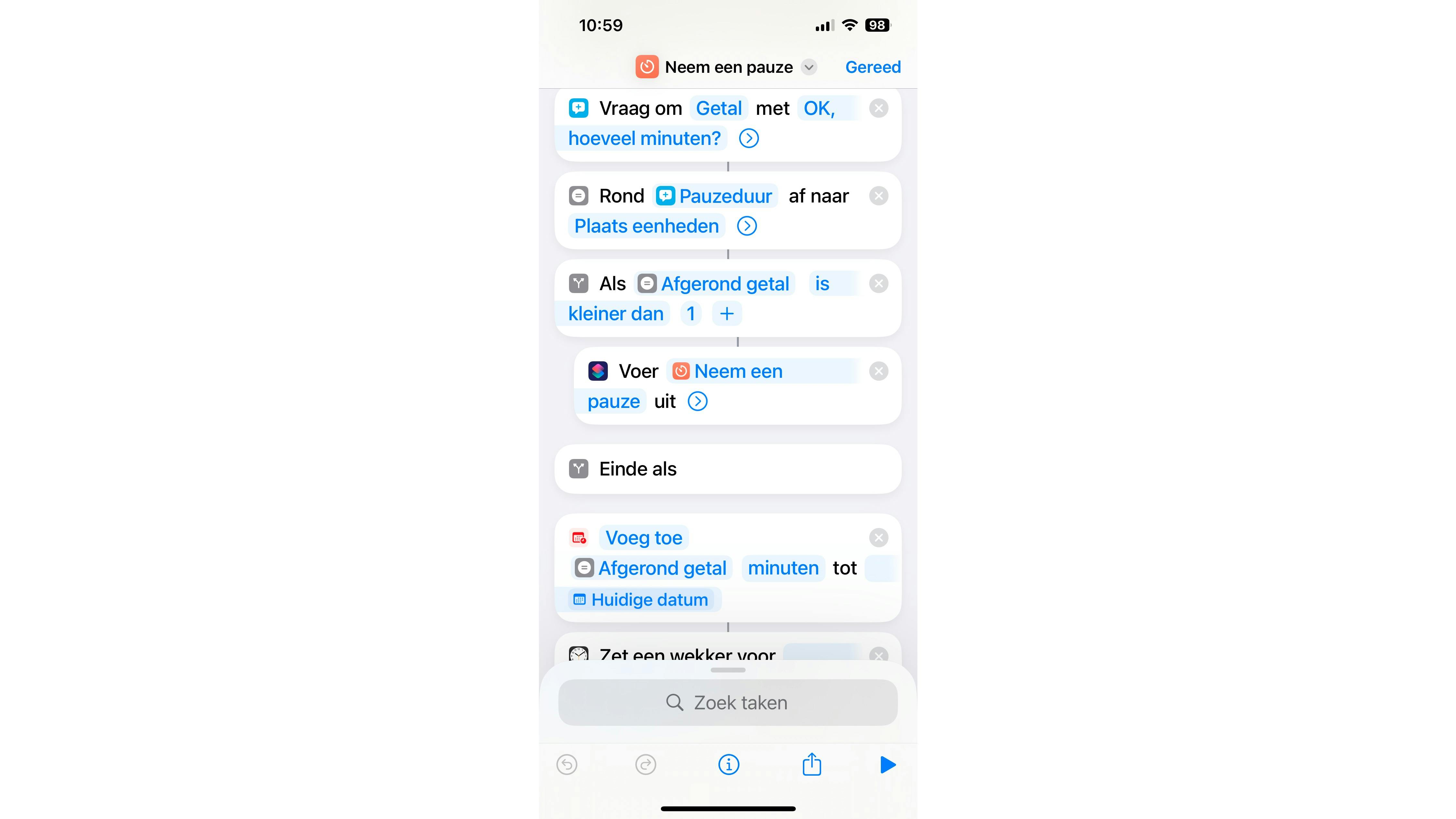 De opdracht Neem een pauze is complexer. Deze vraagt invoer van een getal voor de minuten dat de niet-storen-functie actief moet blijven. Een als-dan-regel controleert of het getal kleiner is dan één. In dat geval vraagt de app opnieuw om invoer. Deze kennis komt wellicht goed van pas bij het maken van je eigen opdrachten.