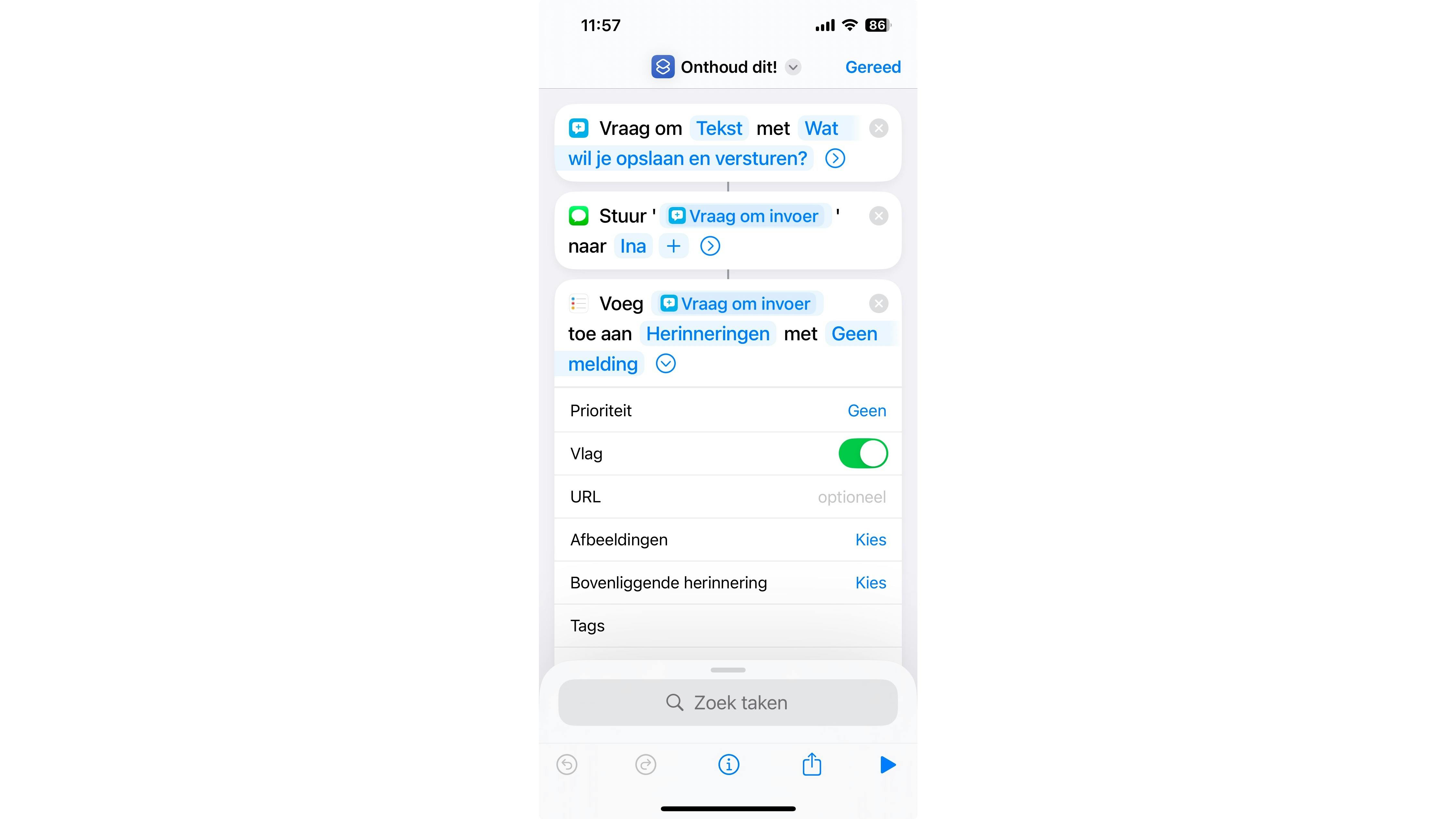 Zoek vervolgens Herinneringen in Zoek taken en kies Voeg nieuwe herinnering toe. Tik op Herinnering en veeg de optiebalk boven het toetsenbord naar links tot je Vraag om invoer ziet. Selecteer deze en tik op Gereed. Via het pijlknopje bij de taak kun je nog extra opties instellen, zoals de Prioriteit of een Vlag.