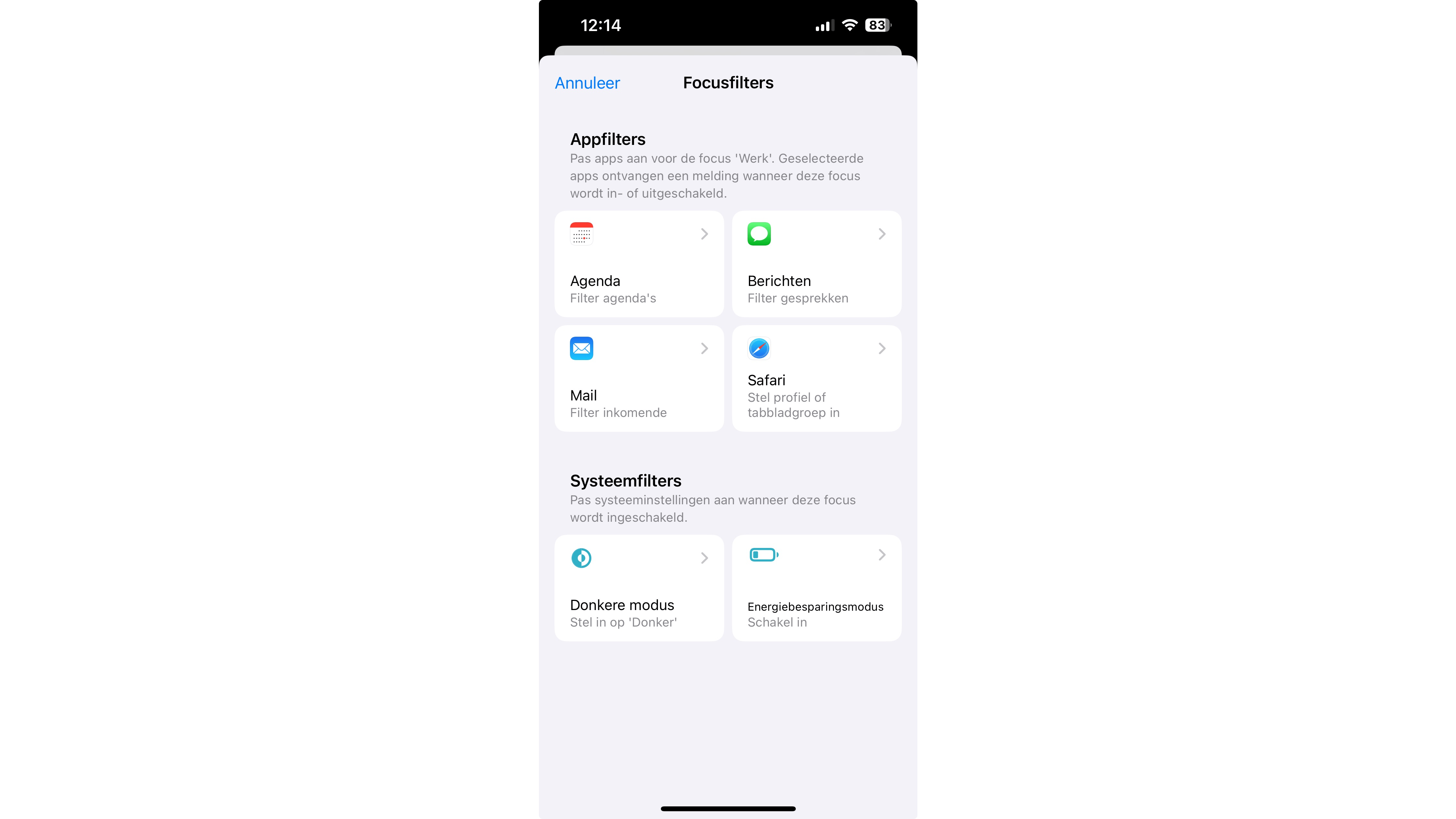 Stel vervolgens de focus naar wens in. Bepaal bijvoorbeeld van welke personen of apps je geen meldingen wilt ontvangen, hoe je toegangsscherm of beginscherm eruit moet zien en hoe specifieke apps of je systeem zich moeten gedragen. Zo kun je instellen welke inkomende mails je wilt zien in Mail, of je de energiebesparingsmodus wilt activeren enzovoort. Tot slot kun je een tijdsschema instellen voor automatische activering van de focusmodus.