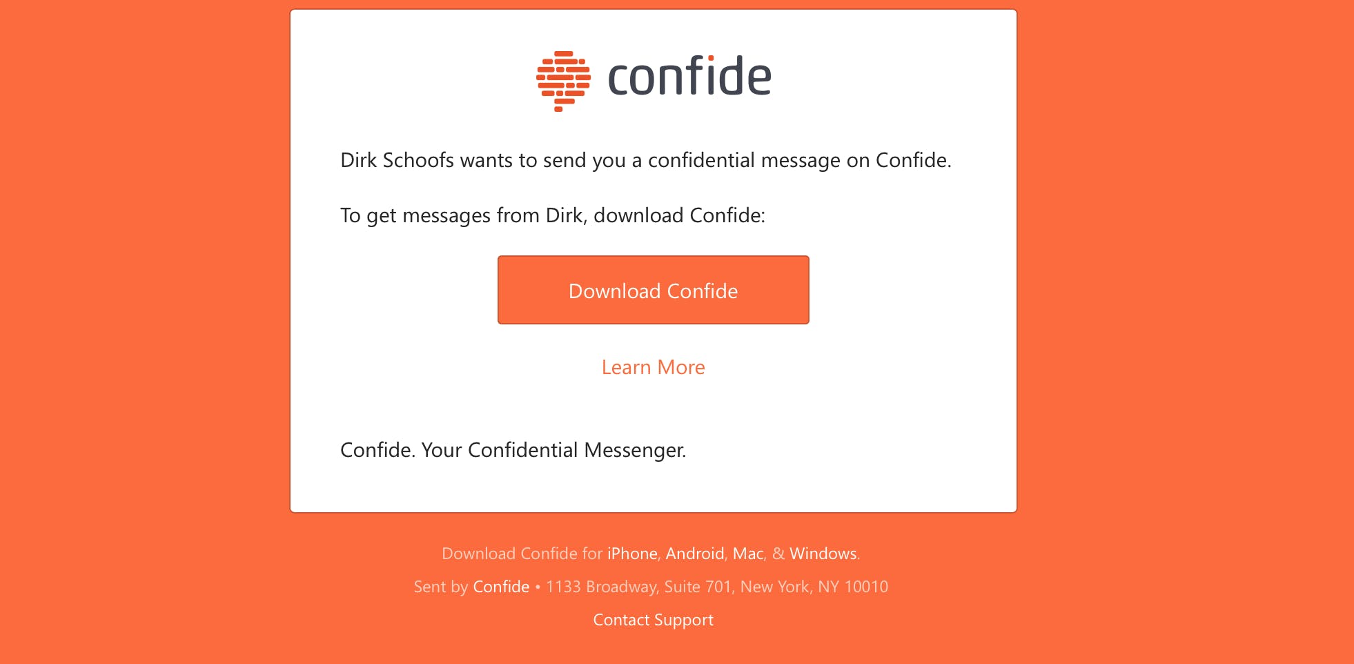 Op www.getconfide.com haal je de installer binnen voor deze ultra-veilige messenger. Er zijn versies voor macOS, Windows, iOS en Android. Je kunt de download-link volgen, voor smartphones is er ook een QR-code om meteen de juiste versie op te halen. Nadat de installer zijn ding heeft gedaan, moet je een account aanmaken en vanaf een link in een mailbericht bevestigen dat je aan de slag wilt met Confide. Je kunt deze Messenger toegang verlenen tot jouw contactenlijst, maar om met iemand via dit medium te communiceren moeten beide partijen de app gebruiken. Wanneer je een versleuteld bericht naar iemand verstuurt die Confide niet heeft, ontvangt deze een boodschap dat er vertrouwelijke informatie op hem wacht en een link om het programma alsnog te downloaden.