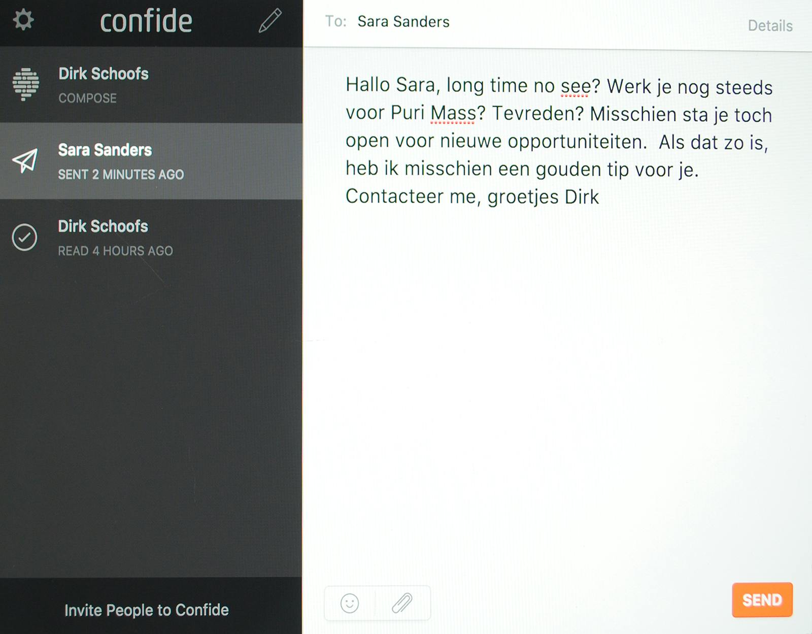 Aan de linkerkant van de app verschijnen de contactpersonen aan wie je rechtstreeks berichten kunt versturen. Je klikt op het contact of je voert een mailadres in bij To: en daarna typ je een boodschap in het vak waar Speak Confidentially staat. Terwijl je typt, zullen er twee knoppen verschijnen: eentje om emoticons te plaatsen en eentje om een bijlage toe te voegen. Confide maakt gebruik van de standaard end-to-end-codering. Dat betekent dat de encryptiesleutel lokaal op ieder apparaat wordt gegenereerd en bewaard.