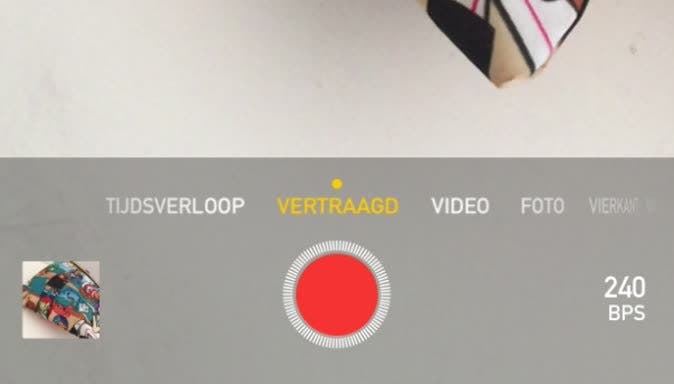 Het voordeel van een iPhone 6 of iPhone 6 Plus is dat het toestel vertraagde video's met 240 frames per seconde kan opnemen. De beelden kunnen dan nog langzamer en beter worden afgespeeld. In het opnamescherm wordt rechtsonderaan het aantal frames per seconde weergegeven. Schakel tussen 120 en 240 beelden per seconden door op het getal te tikken.