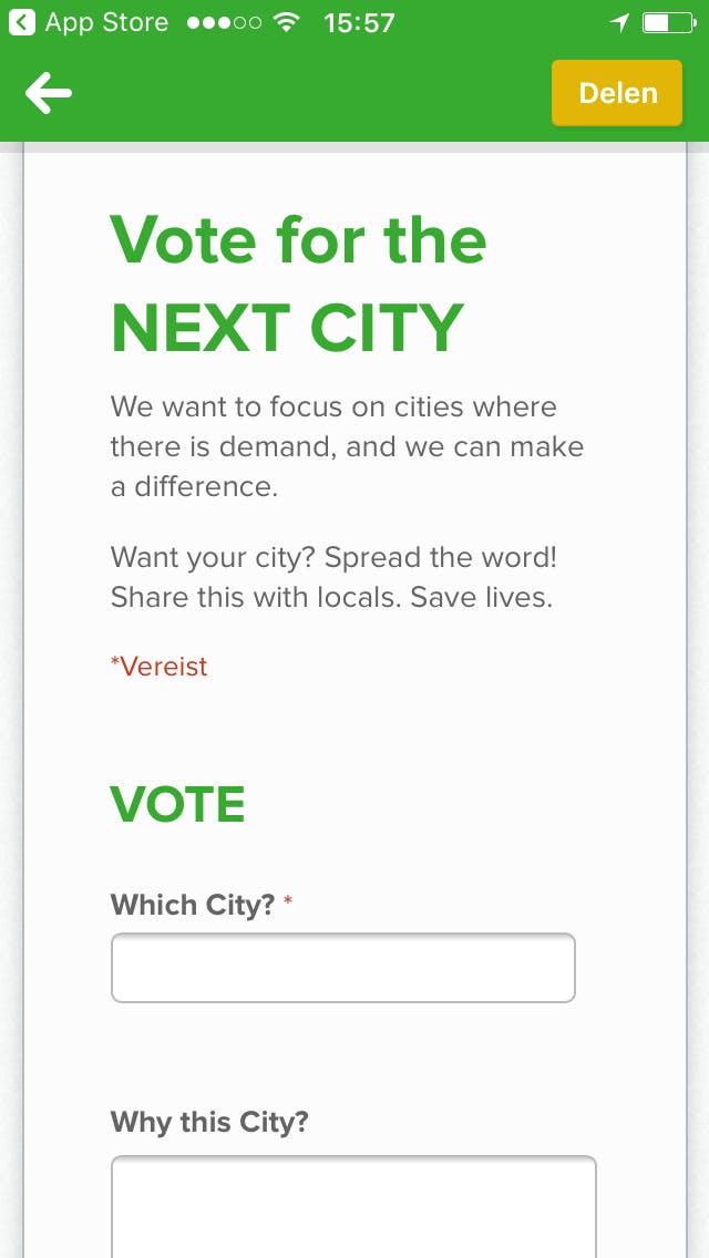 Je kunt je keuze overigens altijd later nog wijzigen door op de drie streepjes te tikken, bijvoorbeeld als je naar een andere stad op reis gaat. Wil je graag dat de app in een andere stad beschikbaar wordt, tik dan op Volgende stad en geef aan welke stad jij het liefst zou willen zien.