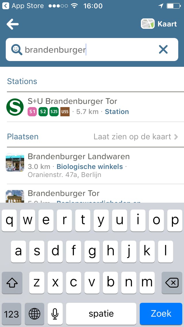 De belangrijkste knop is Ik wil ergens heen. Tik erop en geef een zoekterm in. De lijst wordt automatisch aangevuld, dus je hoeft niet de gehele naam in te toetsen. Als je de bezienswaardigheid of het station hebt gevonden, tik je op het zoekresultaat.