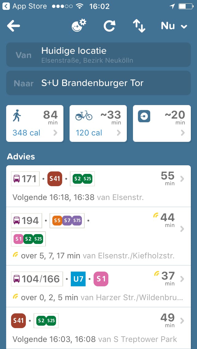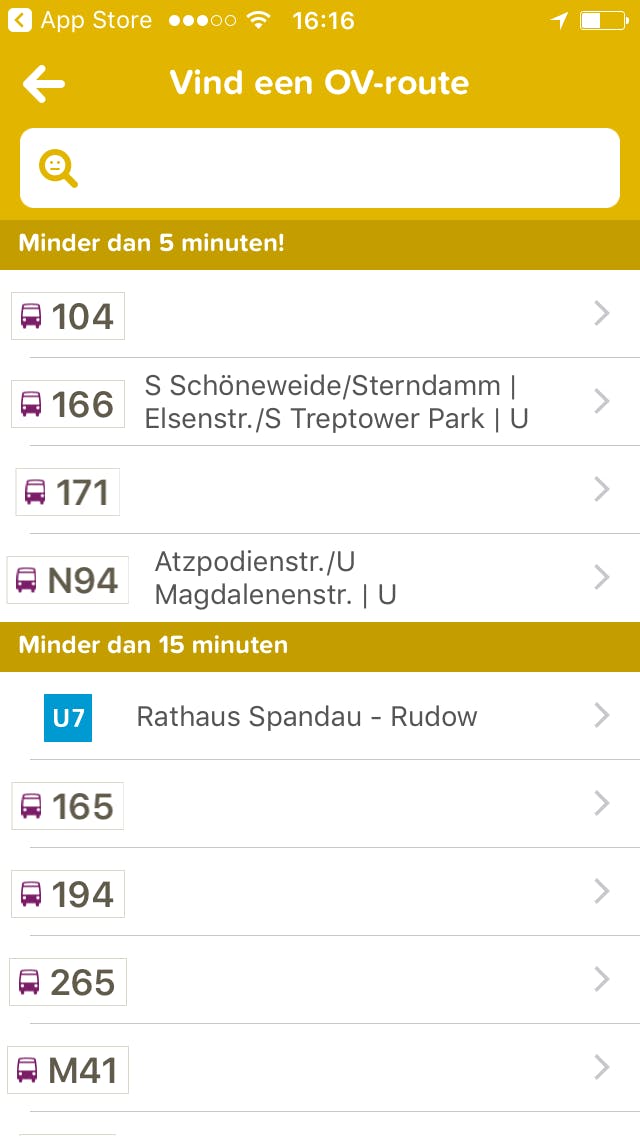 Rechts van een verbindingsoptie zie je hoe lang je onderweg zult zijn. Een geel icoontje bij de tijd betekent dat de app live updates krijgt over vertragingen. Je ziet welke bussen, metro's of treinen je moet nemen naar je bestemming en als je moet overstappen wordt dit aangegeven door een punt tussen de vervoersmiddelen.