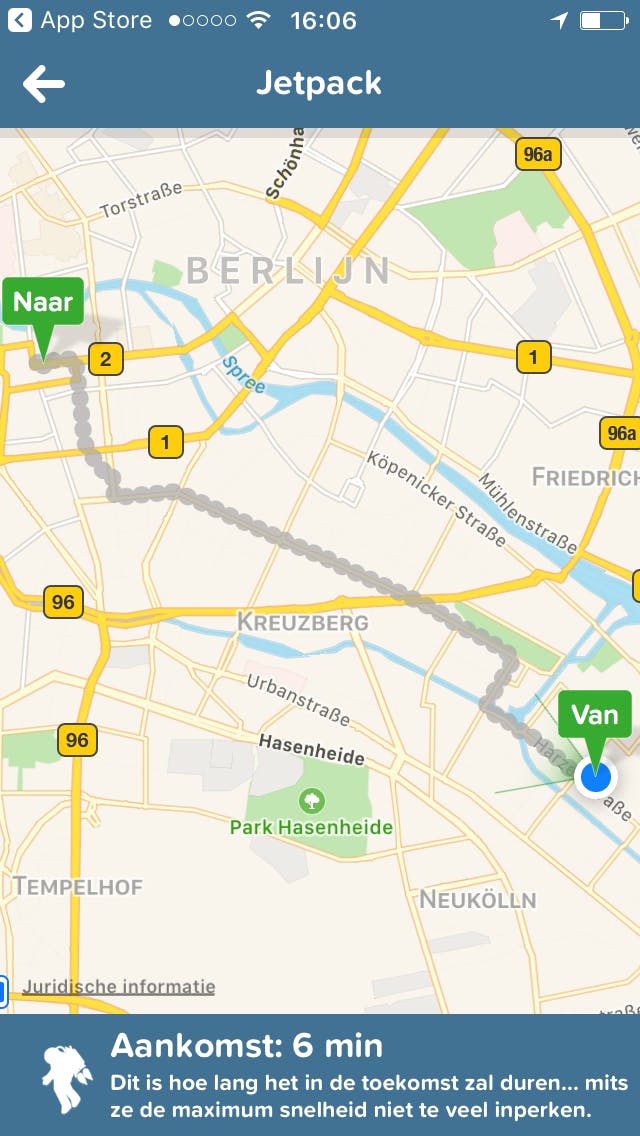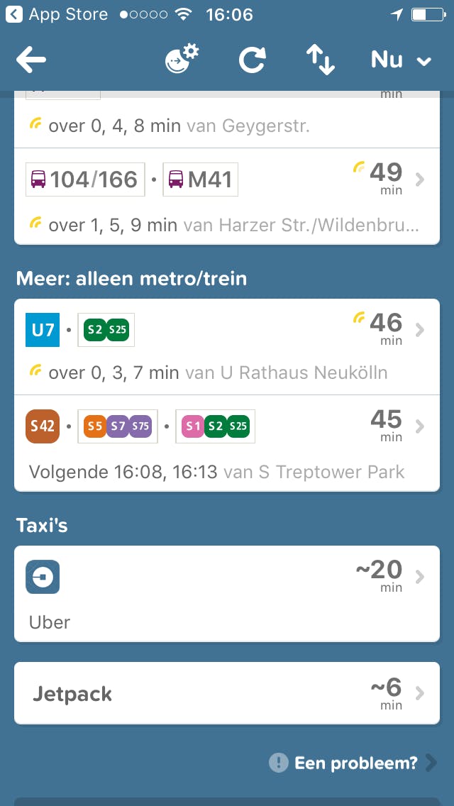 Eronder lees je meteen wanneer je vervoersmiddel precies vertrekt en over hoeveel minuten de volgende gaat. Scroll je naar beneden, dan zie je bij Meer ook andere opties, bijvoorbeeld combinaties van alleen bus en tram of metro en trein. Helemaal onderaan zie je hoe lang je tocht zou zijn als je met een jetpack op je rug zou reizen. Uiteraard is deze functie geheel op eigen risico!