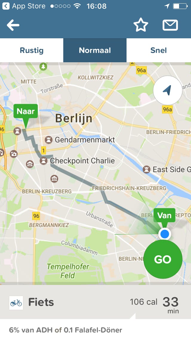 Tik je op de fiets, dan kun je door op de groene knop te tikken meteen de navigatie-assistent starten. Bovenin kies je bovendien voor de opties Rustig of Snel, maar meestal zitten er maar heel weinig verschillen in de opties. Leuk is dat je een route voor later gebruik op kunt slaan door op het sterretje te tikken. Deze route is dan bovendien offline beschikbaar.