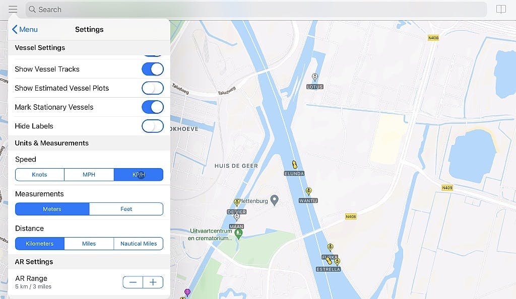 De knop AR is ook alleraardigst, hiermee kijk je met je smartphone om je heen en krijgen zichtbare schepen vanzelf een label. We konden deze feature echter niet testen, want momenteel verkerend in een volledig scheepvaartloos gebied. Maar deze optie is ideaal in bijvoorbeeld havens of langs een drukbevaren kanaal of rivier! Met de meest rechtse knop forceer je een refresh van de gegevens. In de praktijk zal dat nooit echt nodig zijn. Maar soms zie je een schip een woonwijk invaren. In negen van de tien gevallen is er dan geen ramp gaande, maar volstaat een update om een schip weer in het gareel te brengen.