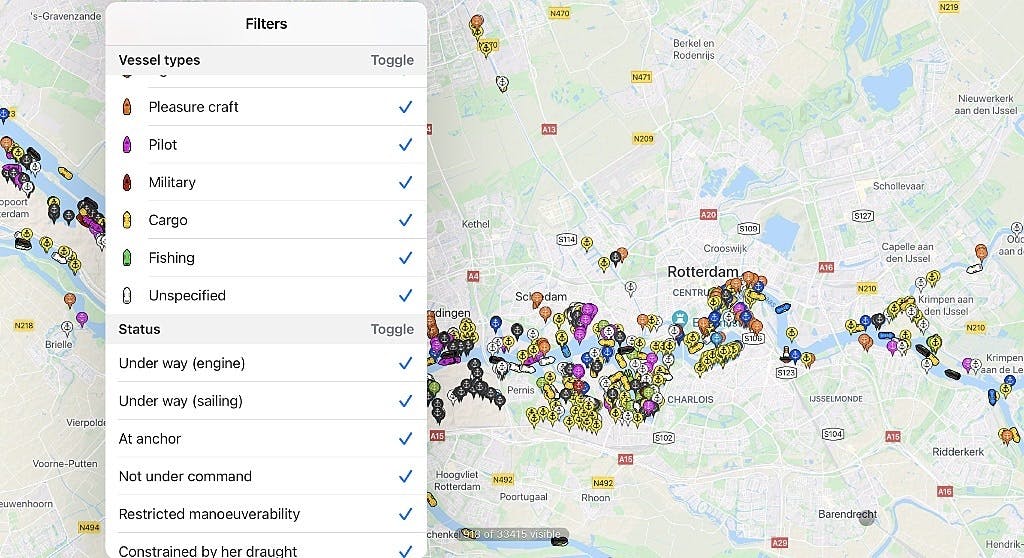 Ben je klaar met instellen, dan keer je weer terug naar het hoofdvenster van de app. Onderin beeld tref je een aantal interessante knoppen aan. De meest linkse voert je direct naar je huidige locatie. De knop daarnaast is het filter. Standaard is elk soort schip ingeschakeld. Wil je bijvoorbeeld alleen militaire scheepvaart volgen, dan zet je alles behalve Military uit. Ook is het mogelijk om te filteren op status/activiteit. Denk aan bijvoorbeeld vissen, onderweg of geankerd, aan de grond gelopen enzovoort. Kortom: genoeg mogelijkheden om heel specifiek bepaalde vormen van scheepvaart te volgen.